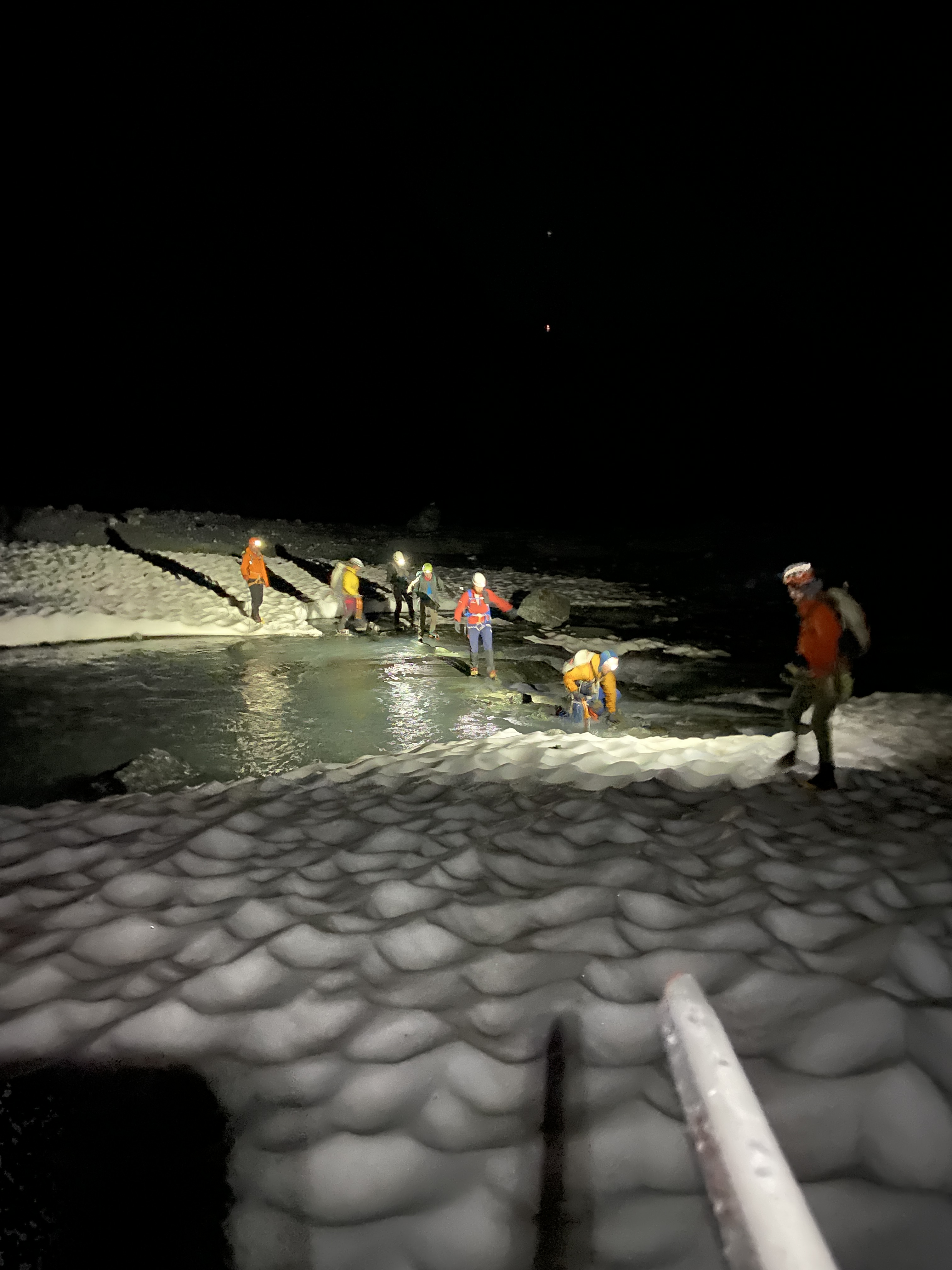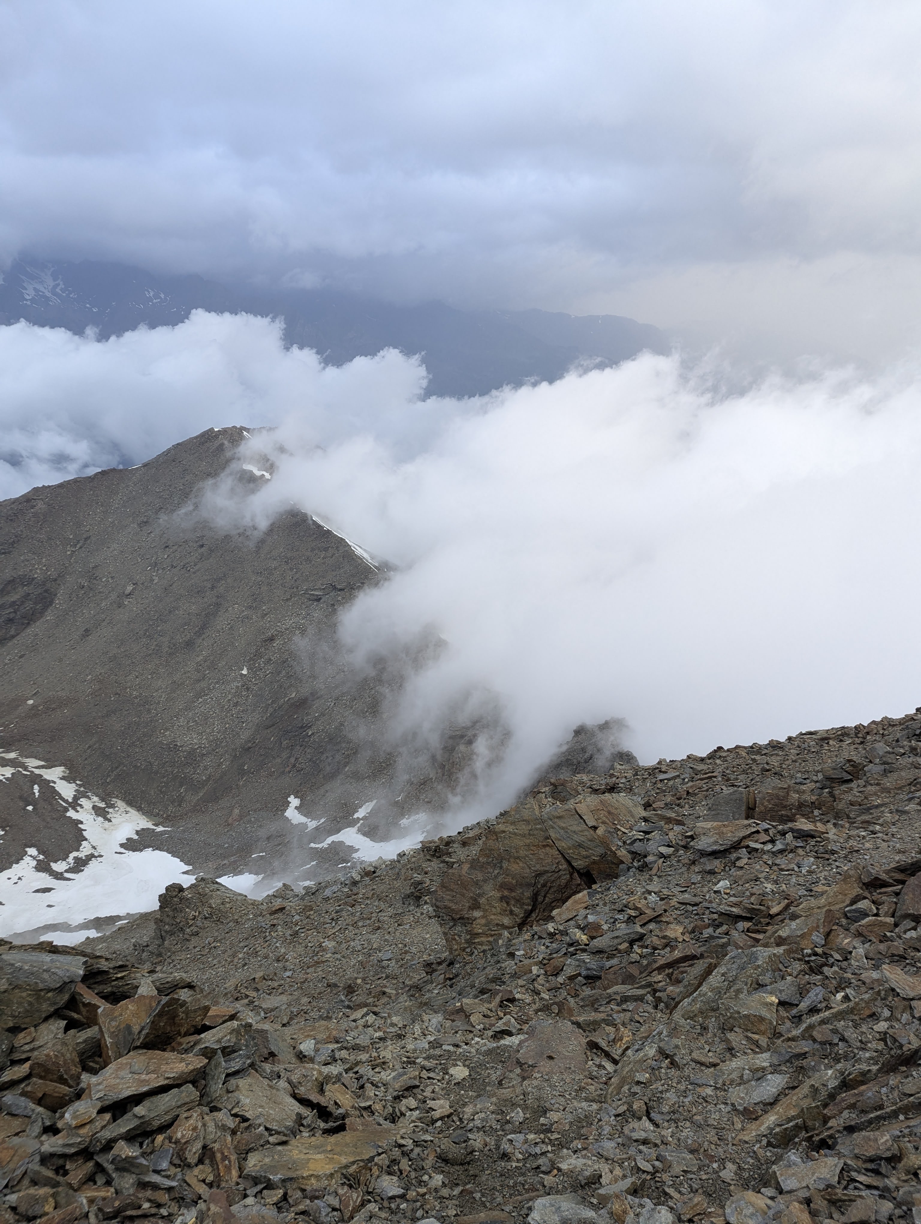 ’s Ochtends (’s nachts?) stond iedereen min of meer paraat om aan de tocht te beginnen. De eerste grofweg drie uur om tot op de graat te geraken verliepen vlotjes. Voor de graat zelf dan werd even overwogen om in te binden, maar vanwege de lage technische moeilijkheid en de grote hoeveelheid losse rots werd door bijna elke cordée besloten om dat niet te doen. Alleen Felix en Liedewij touwden in, waarna ze even later toch besloten om hier mee op te houden, inderdaad omwille van de losse rots. Intussen zagen we wel wolken vormen in de vallei, en onze weerradar begon meer en meer onheilspellende vooruitzichten te tonen. Tegen 6:00 besloten we uiteindelijk om terug te keren. Denis suggereerde nog om even verder te gaan om toch een kleine top te behalen, aangezien we in de afdaling waarschijnlijk toch nat zouden worden, maar de consensus van de groep was om zo snel mogelijk terug te keren over het losse stuk graat, omdat we dit liever niet in de regen wilden doen. Dit beslissingsproces was een bijzonder belangrijk leermoment in risico-inschatting. En hoewel we uiteindelijk maar een beetje miezer (en veel wind) te verduren kregen, was de hogere sectie van de graat de rest van de middag in de wolken verstopt. Daarbij leerden we ook om onze veiligheidsbeslissingen niet achteraf te betwijfelen (‘Wat als we toch..?’), omdat zo’n redeneringen tot gevaarlijke situaties kunnen leiden. We maakten de keuze die ons juist leek op dat moment, met de informatie die toen beschikbaar was.