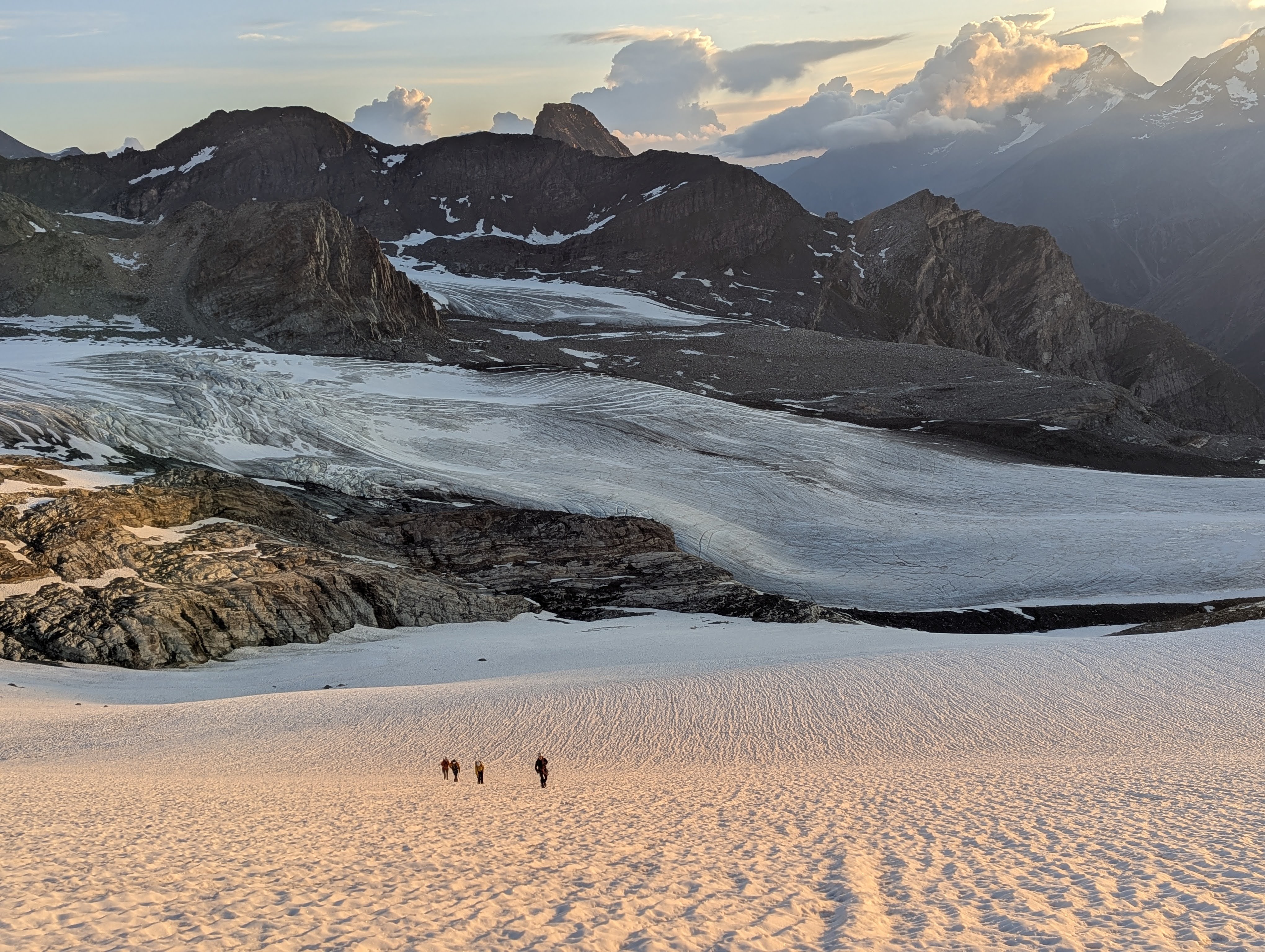 Eens de top bereikt te hebben, konden we beginnen aan de lange afdaling over de Allalingletsjer. Het was ondertussen al goed warm, waardoor de sneeuw heel zacht was en we vaak tot aan de knieën of zelfs heupen wegzakten. Fysiek en mentaal vermoeid kwamen we weer aan bij de hut, klaar om met onze kaarten en topo’s de tocht voor de volgende dag voor te bereiden. Op deze eerste gletsjertocht bleken vooral onze gezamenlijke voorbereiding en teamwork nog verbetering te kunnen gebruiken, dus dat werd onze focus. Last van hoogteziekte was ook voor sommigen een factor, het was dan ook nog maar de tweede dag waarop we boven 3000m gingen.