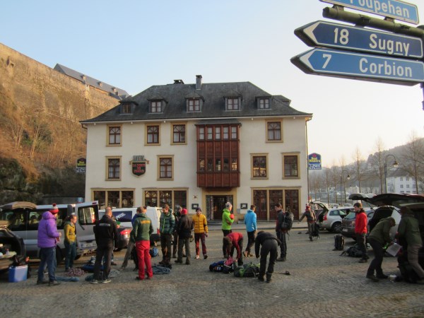 Een stevige bende, zo ‘s morgens vroeg aan het kasteel van Bouillon. Naast de vijftien ietwat zenuwachtige kandidaten vatten ook Sanne zelf, An en een handvol vorige Mount Coachers de tocht van Bouillon naar Vresse aan. Enkele deelnemers hadden zelfs hun vriendin zover gekregen om deze tocht geheel vrijwillig mee te wandelen. Na een koffietje werd het startsein gegeven en de troep schoot met een stevige pas uit de startblokken. Al snel werd duidelijk dat niet iedereen op hetzelfde fysieke niveau zat: reeds aan de abdij van Clairefontaine lag de groep over een afstand van haast een kilometer verspreid. Maar niemand gaf de moed op; deze wandeling is slechts een onderdeel van het strenge selectieweekend.
