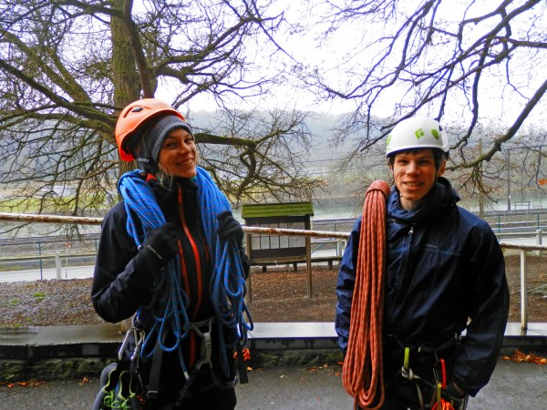 Laura en Koen vrolijk en klaar voor de ietwat beregende rotsen. (foto: Amber)