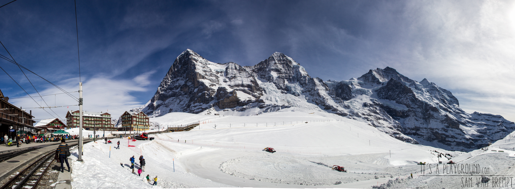 Vanuit Gridelwald nemen we een treintje richting Kleine Scheidegg en voor een snelle instijg zelfs een beetje hoger, het Eigergletsjer station. Ginds aangekomen blijkt dat er minimum 5 touwgroepen in de wand willen kruipen.