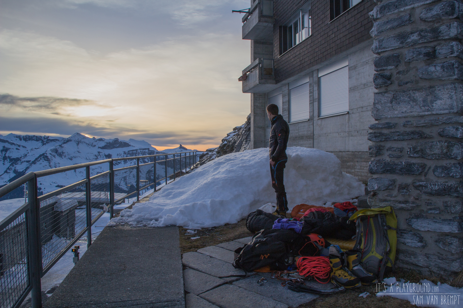 Alles gepland en afgesproken, Maxime kwam me vrijdagavond 28 maart ophalen en we rijden een eindje richting de Alpen. Halverwege slapen we een 8 tal uren om dan de volgende dag iets na de middag in Grindelwald aan te komen. We worden omgeven door serieuze wanden. Maar als we dan toch moeten toegeven, de Eiger zien we niet direct liggen. We sorteren ons materiaal uit tot ik plots terug naar boven kijk en toch enkele sneeuwvelden in die enorme wand voor ons me toch bekend voorkomen. We zijn zo gewend aan het klassieke Eigerbeeld uit Kleinde Scheidegg dat we hem hier beneden op de parking niet direct herkennen.