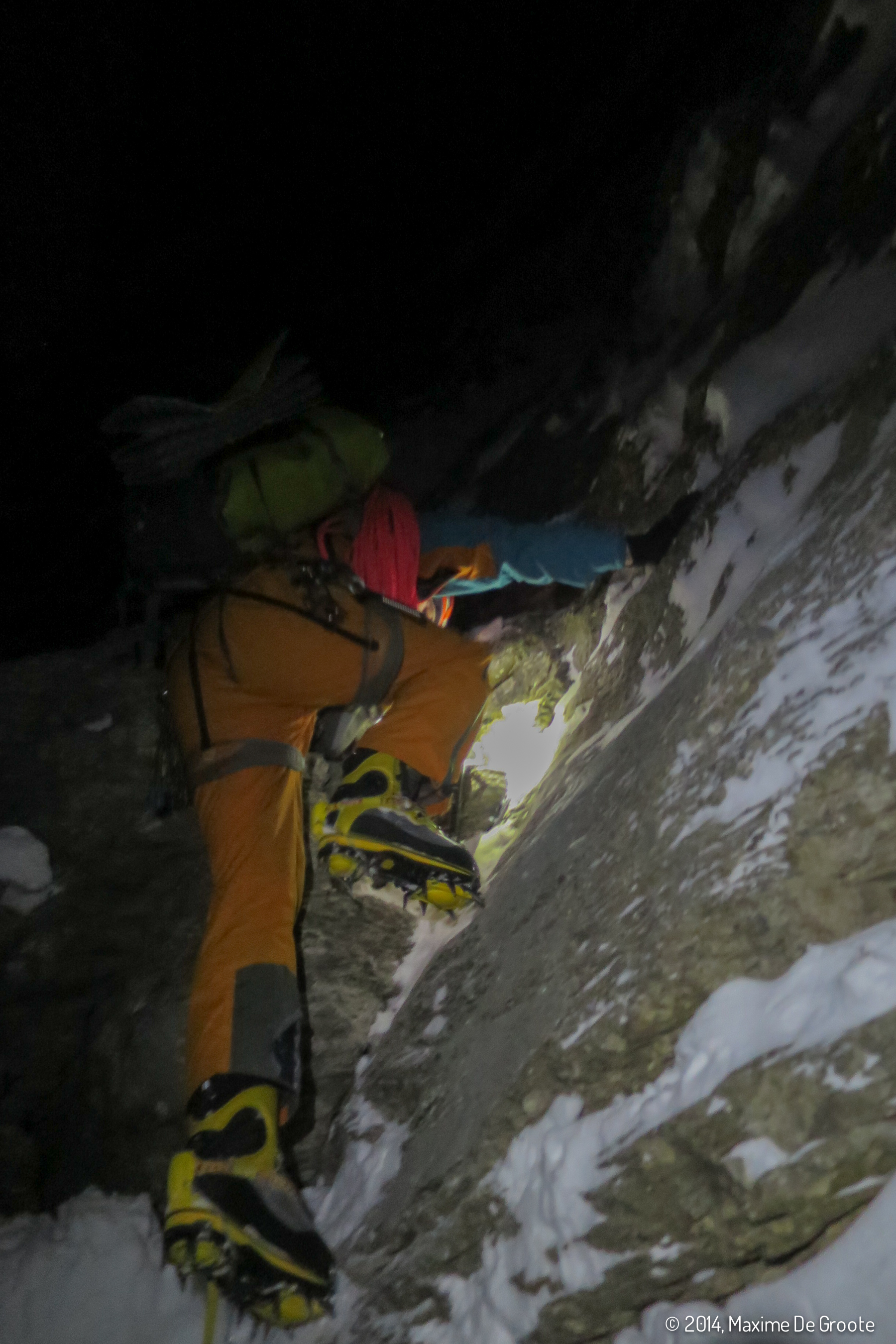 De ramp is de enige zwakkere passage doorheen de enorme centrale wand. We klimmen alternerend, aangenaam terrein, met sporadisch een steiler moeilijke sectie. Het grootste probleem is onze rugzak die in deze schoorsteen geregeld klem zit. Eindelijk komen we aan de waterval lengte. We weten niet of er normaal ijs in deze lengte ligt maar bij ons is ze kurkdroog. Maxime klimt deze een overhangende schoorsteen met de hulp van enkele vaste slings en touwtjes. Ook de eerste 15 meter van de volgende lengte (“the ice bulge” ) zijn nog heel stevig. Snelheid is ons veel te belangrijk geworden, uitzoeken hoe we deze het beste vrij beklimmen doen we niet. Ik beklim deze lengte dus ook met het nodige getrek aan het materiaal. We klimmen nog 1 eenvoudige lengte, verlaten de ramp en komen uit op een klein ijsveld. Het begint stilaan te schemeren en we voelen ons leeg maar slapen is nog geen optie, er resten ons nog 2 lengtes tot een geschikt bivac. We starten aan de eenvoudige maar akelige traverse met veel losse brol, “de britlle ledges” geheten. Vervolgens staan we voor de laatste moeilijkheid van de dag. We beklimmen de korte stevige “brittle crack” en staan in het donker aan het begin van de godentraverse.