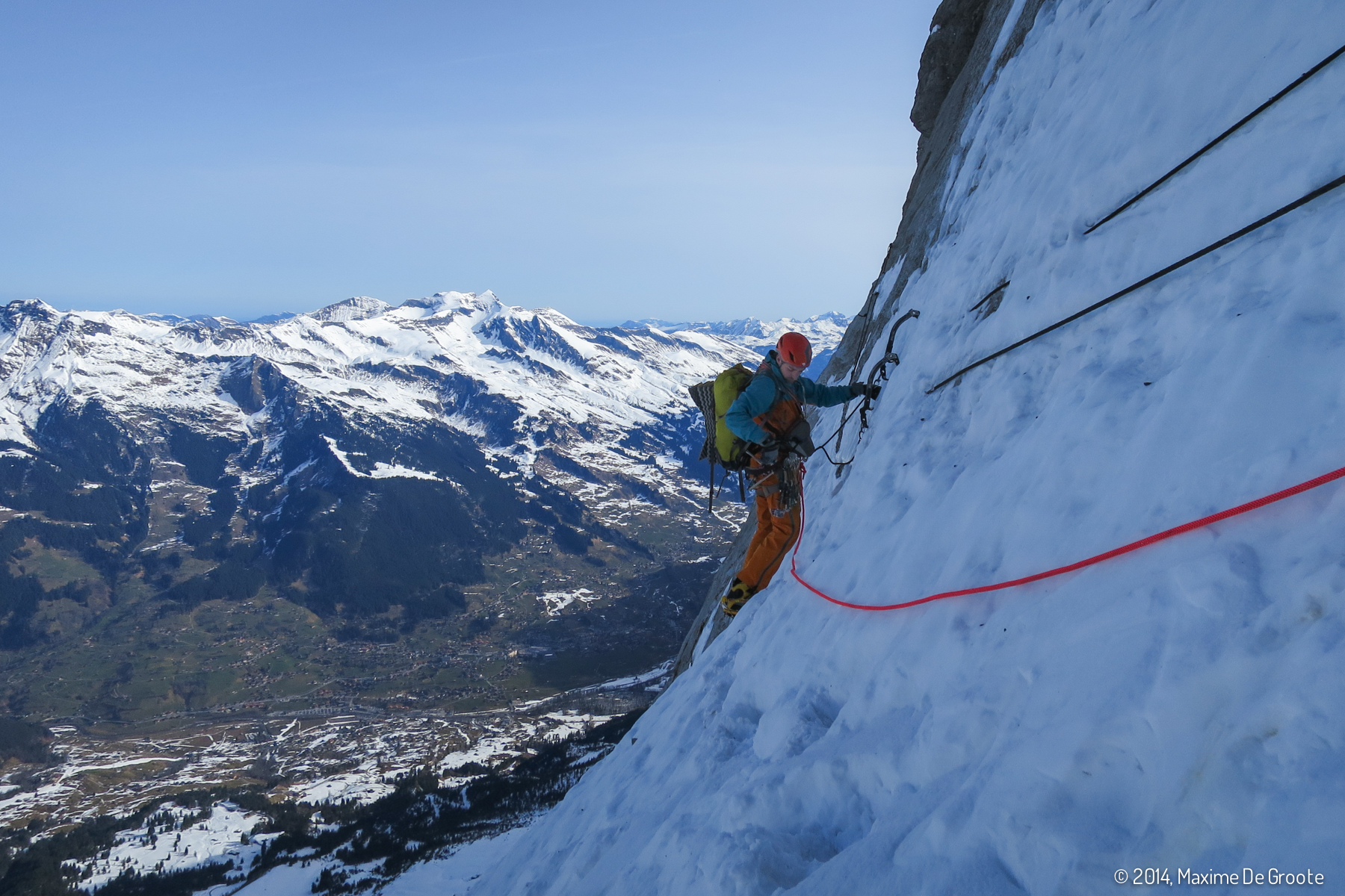 Enorm ontzag voor Hiterstoisser die dit in 1936 geklommen heeft maar geen haar op mijn hoofd dat dacht om het te proberen vrij te klimmen. Eerst nog een 20 tal meter steil ijs maar dan blanke rots. Gelukkig hangt er nog steeds een vast touw waardoor we het in enkele minuten overschrijden.
