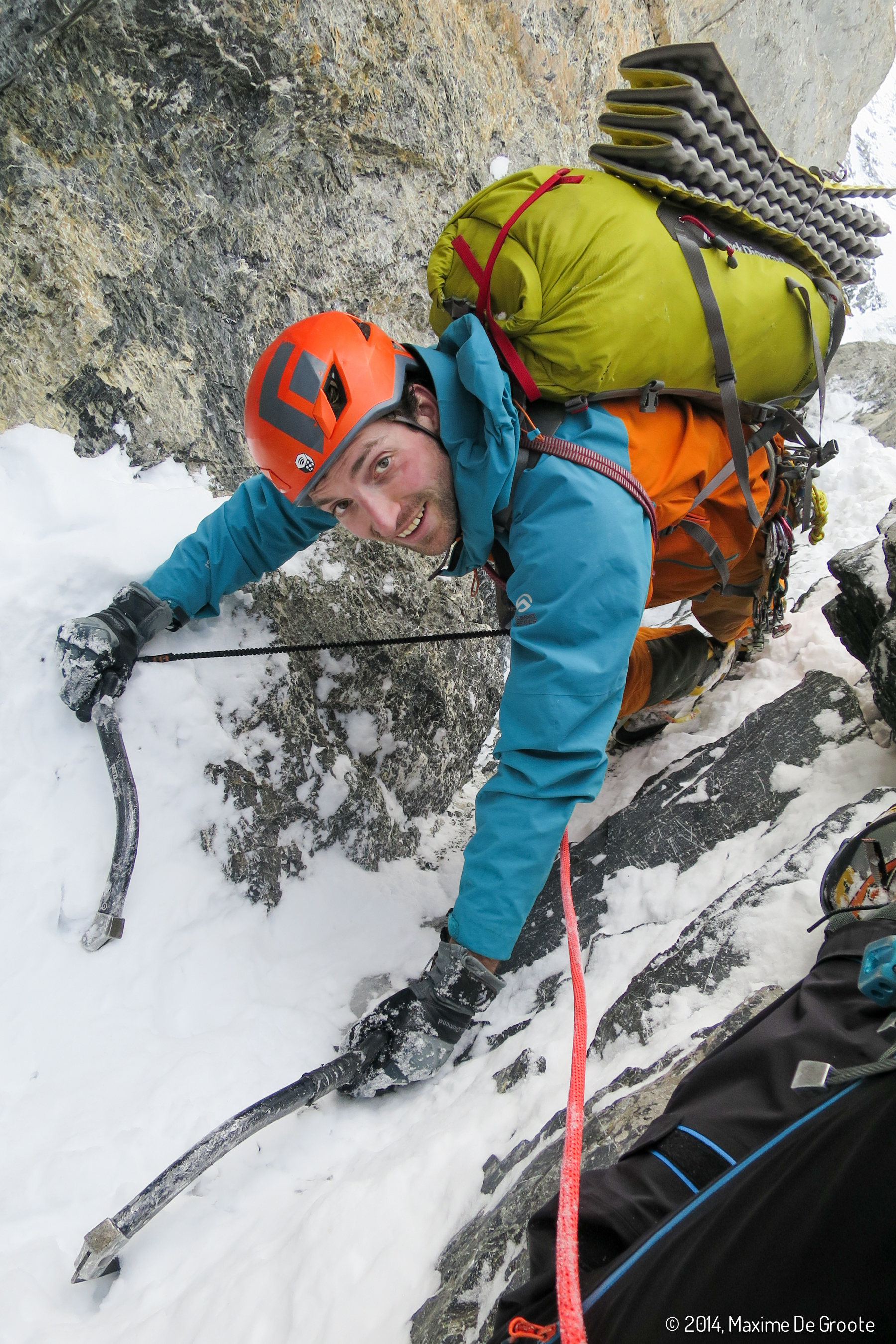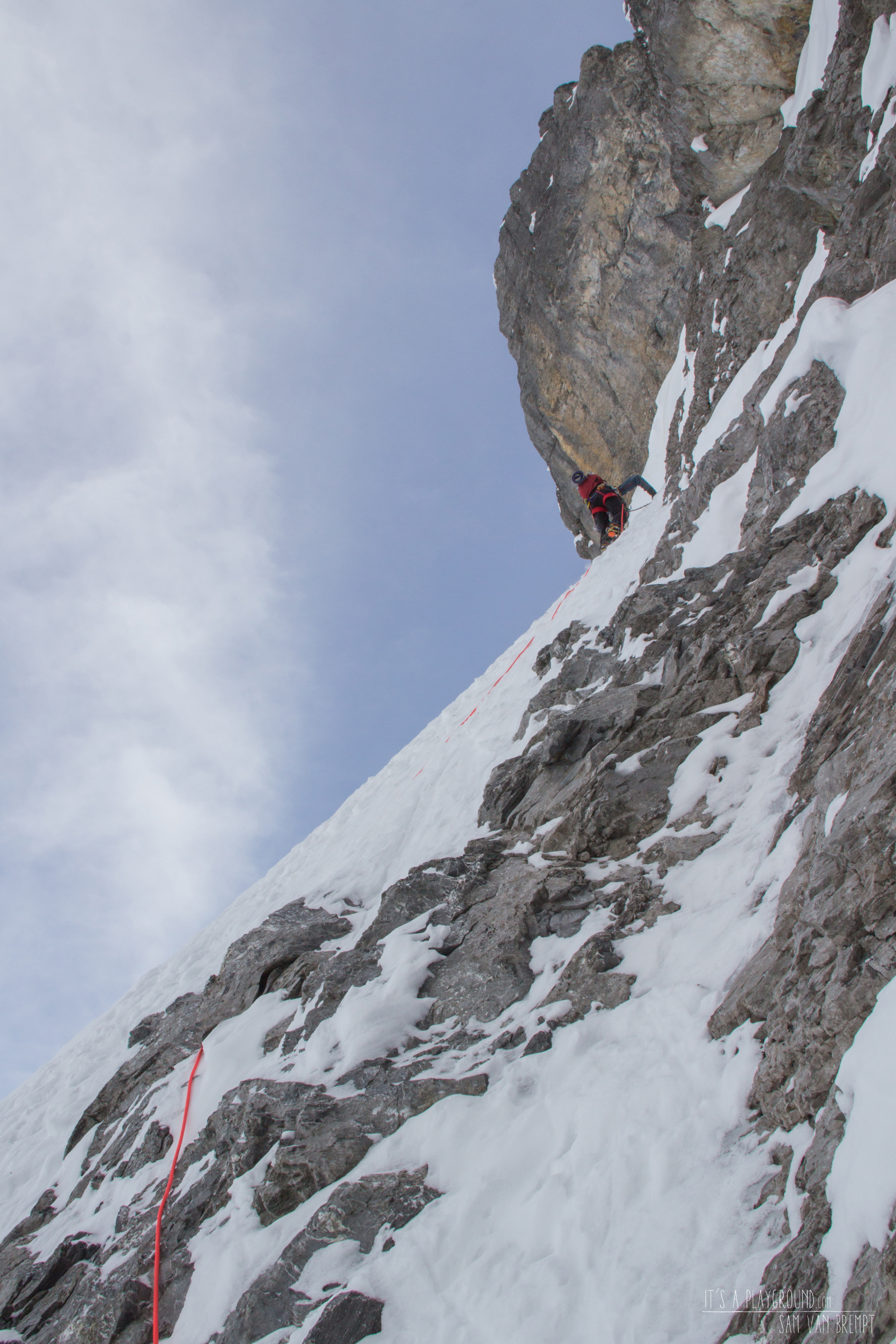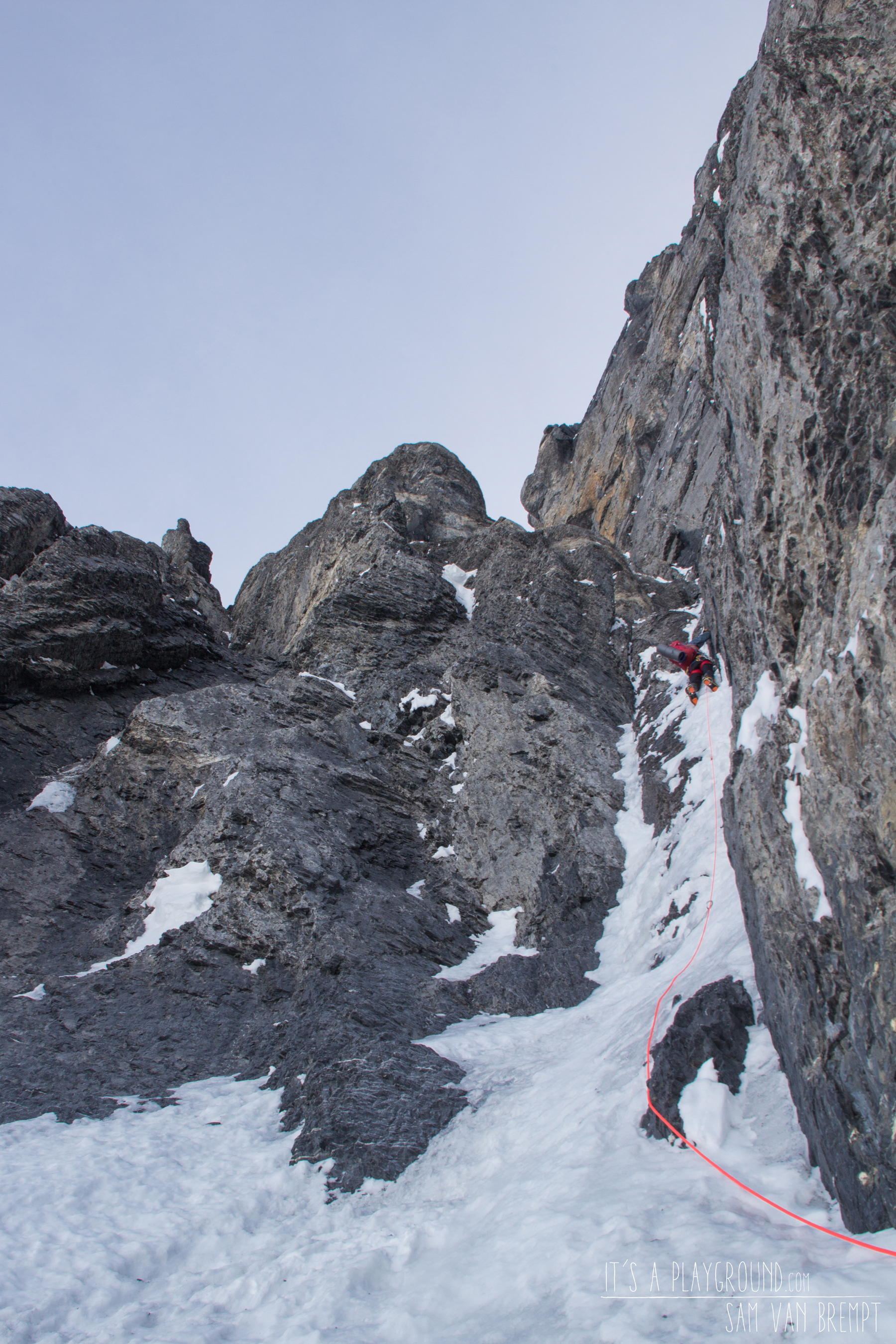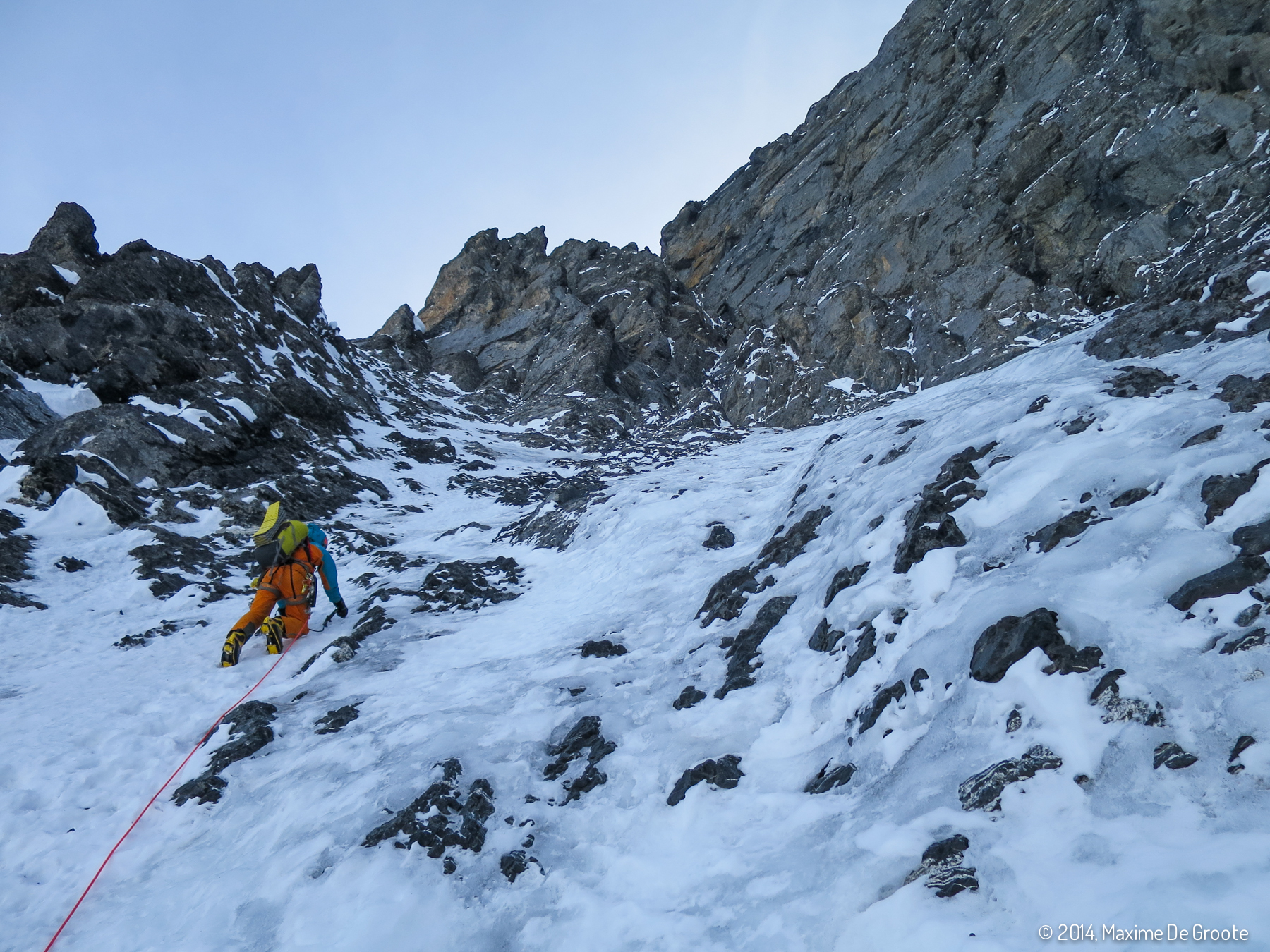 We staan onderaan de “exit chimneys”, de laatste 100 moeilijke meter. Van onderuit ziet het er eenvoudig 4de graads terrein uit. Maar als Maxime de eerste lengte start is het snel duidelijk van niet! Ijsbijlen vinden weinig houvast, en zelfs met blote handen is het moeilijk klimmen op deze gladde afhellende rotsgrepen. Op de koop toe is het nog eens behoorlijk moeilijk om deze lengtes af te zekeren.