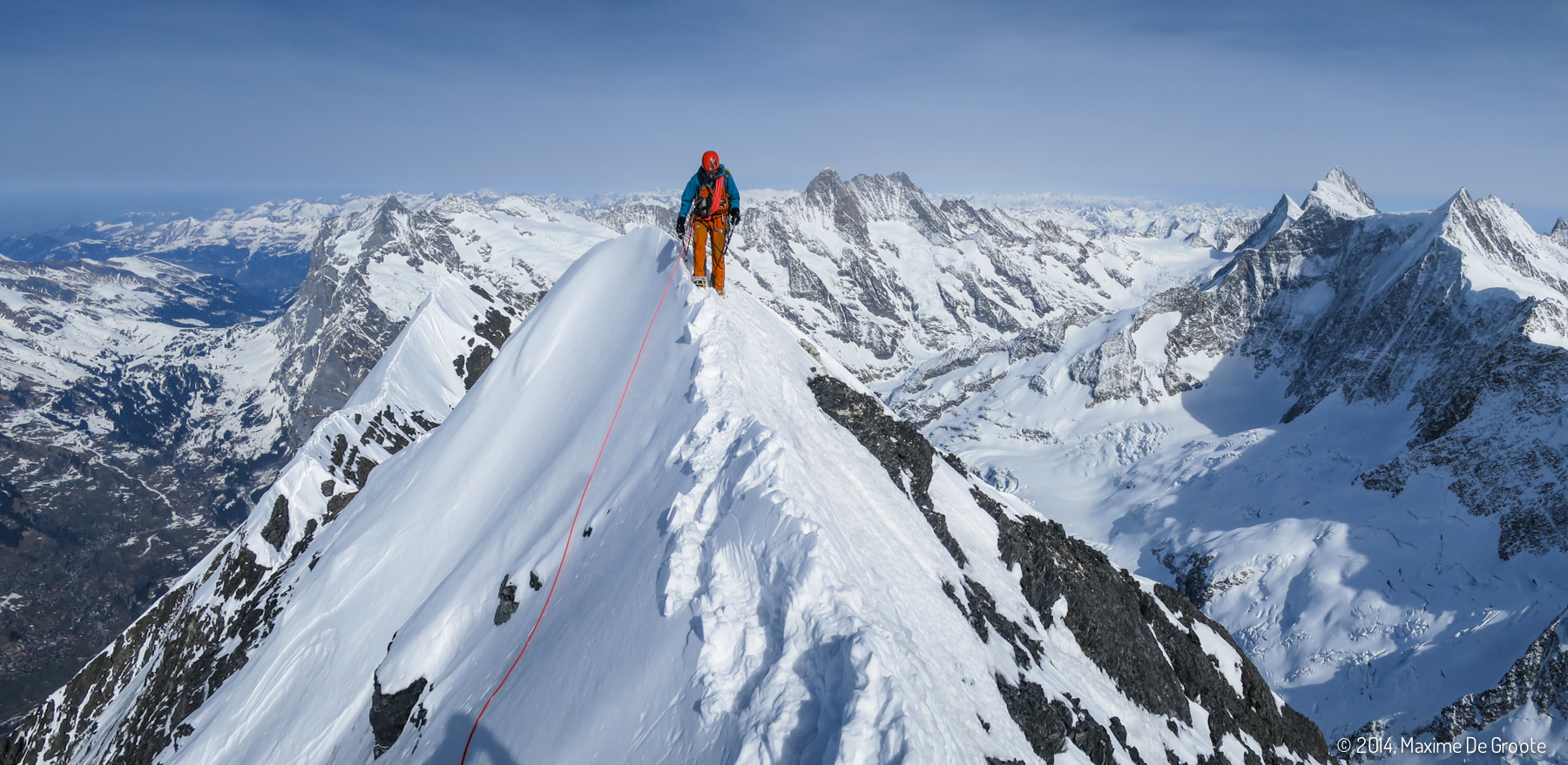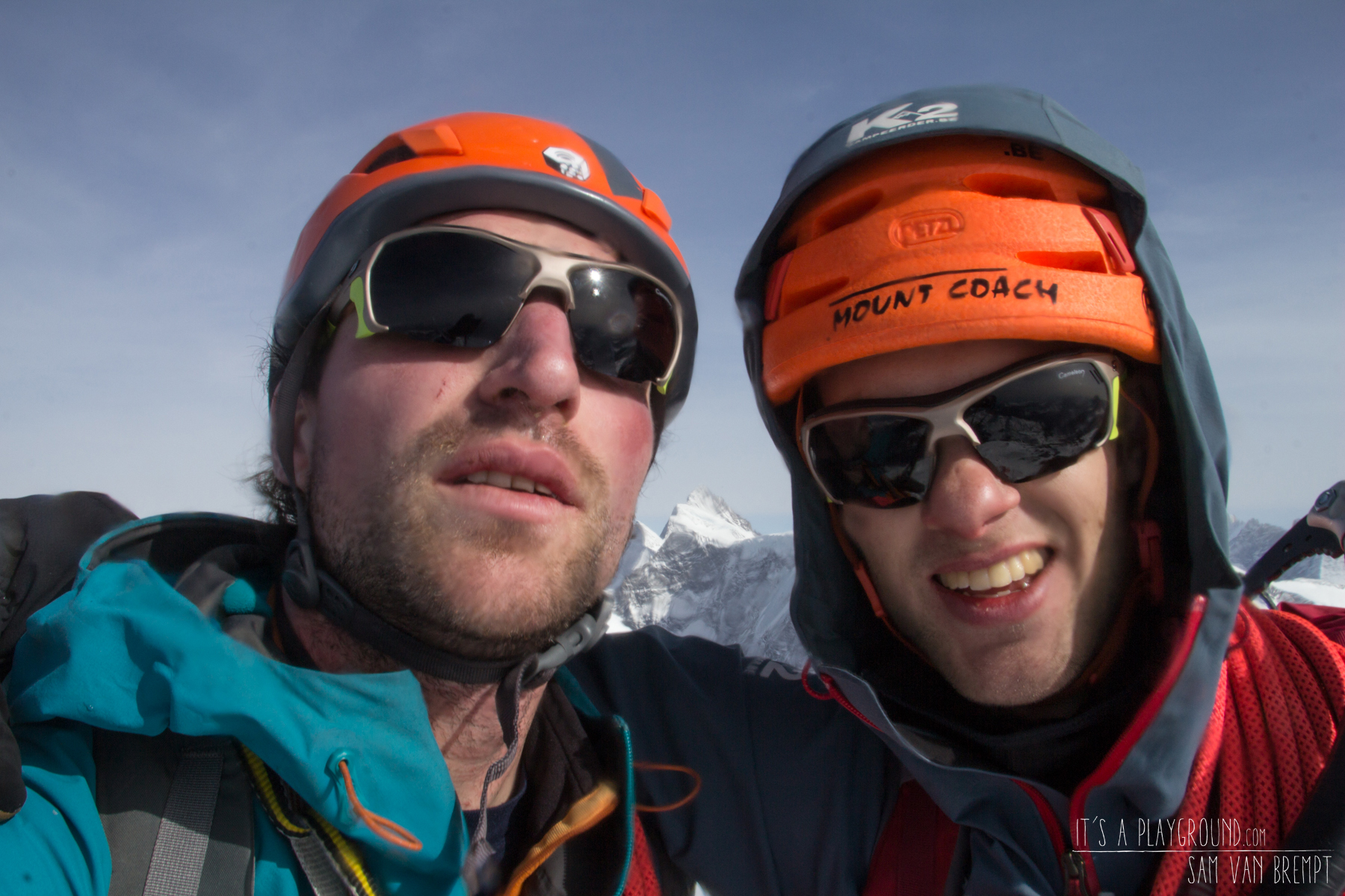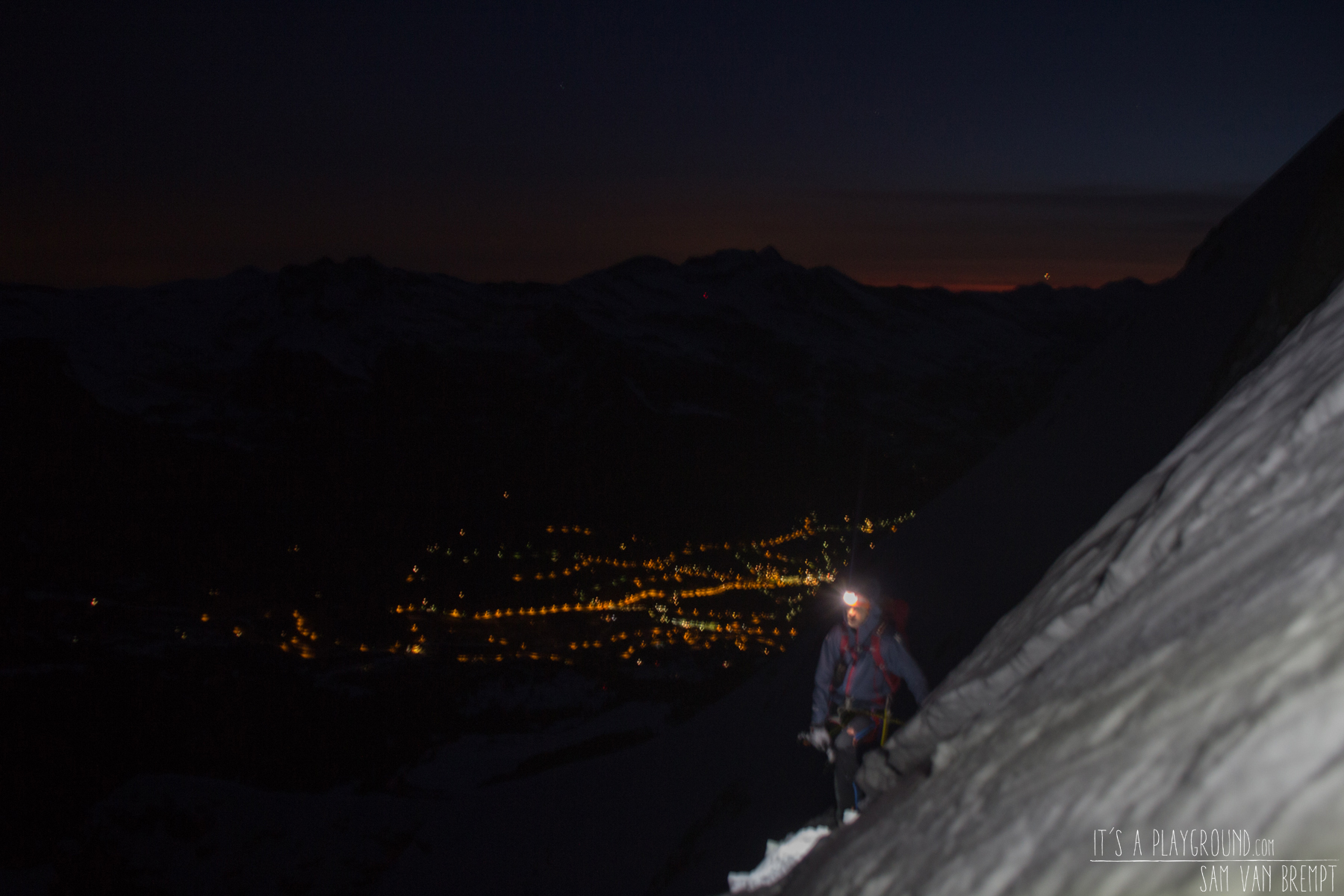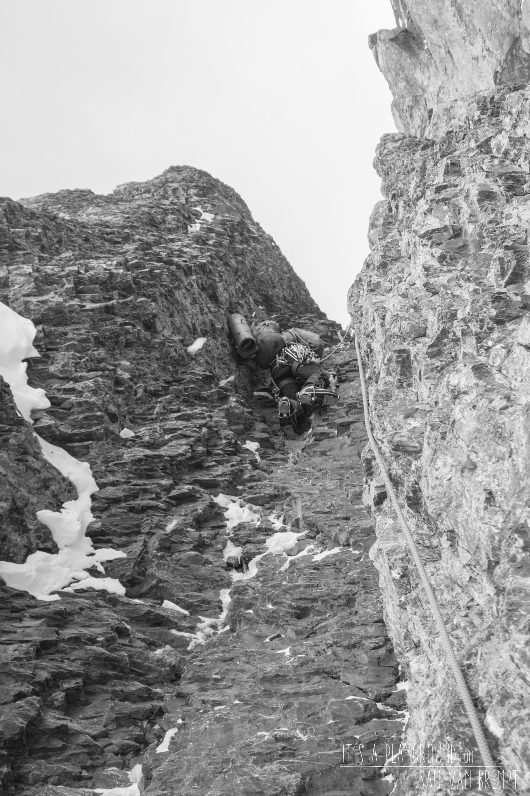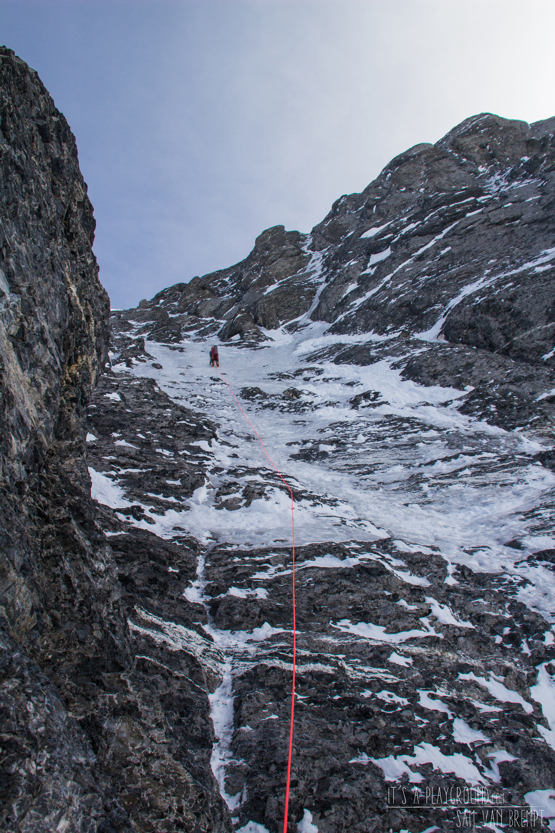 We staan onderaan de “exit chimneys”, de laatste 100 moeilijke meter. Van onderuit ziet het er eenvoudig 4de graads terrein uit. Maar als Maxime de eerste lengte start is het snel duidelijk van niet! Ijsbijlen vinden weinig houvast, en zelfs met blote handen is het moeilijk klimmen op deze gladde afhellende rotsgrepen. Op de koop toe is het nog eens behoorlijk moeilijk om deze lengtes af te zekeren.