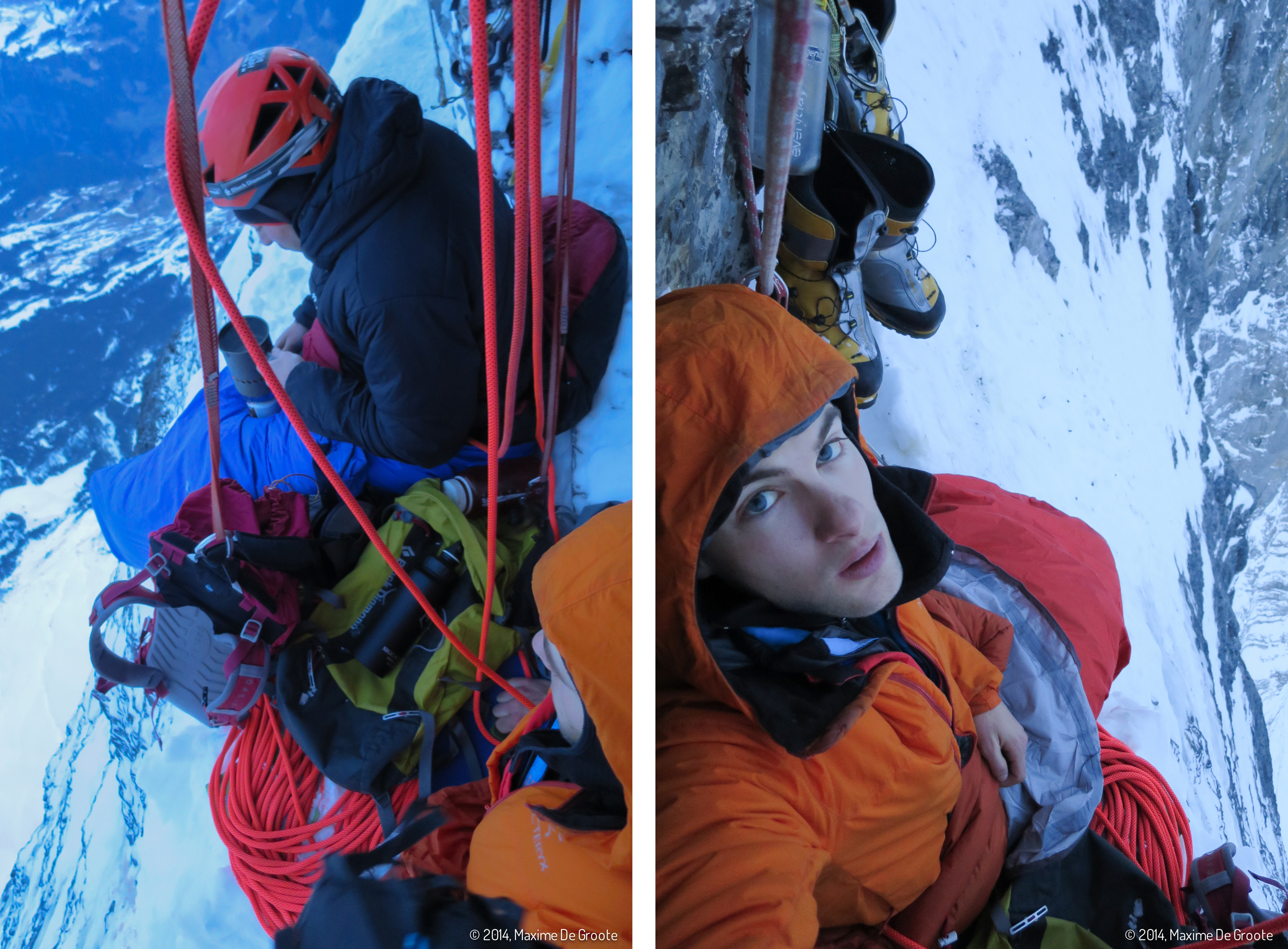 We slaan de hoek om, een korte moeilijke passage brengt ons op het eerste ijsveld. Dit is een van de laatste plaatsen waar je nog gemakkelijk op je stappen kan terugkomen. Een Poolse cordée die de gehele ochtend het spoor heeft gemaakt is serieus vermoeid en besluit af te dalen. Maxime leidt ons naar de “ice hose” een moeilijke sectie die het eerste met het 2de ijsveld verbindt. Een lengte die als blanke rots begint, verder gaat in een delicate 5 centimeter dunne plak ijs en geleidelijk dikker wordt. Maxime neemt het over en simultaan traverseren we het reusachtige 2de ijsveld.