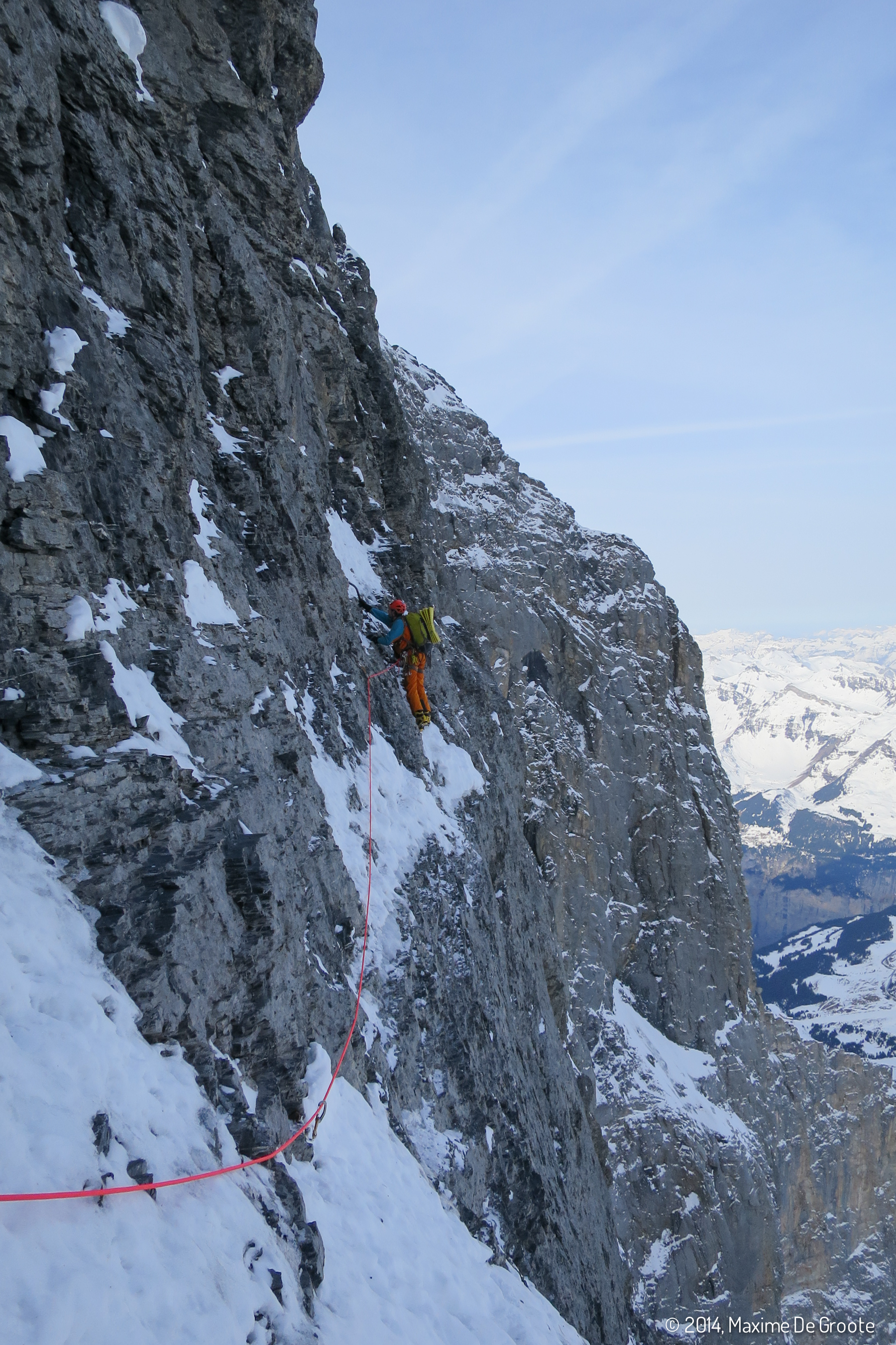 Zonder overdrijven kan ik zeggen dat we de gehele nacht om de 20 minuten zijn wakker geworden. We staan dan ook pas laat op en omstreeks 8u30 start Maxime de eerste lengte van de godentraverse. De moeilijkheid ligt nooit hoog, maar hier, halfweg de Eiger noordwand met meer dan 1000 meter onder onze voeten en al deze losse rots is het toch voorzichtig voortbewegen.