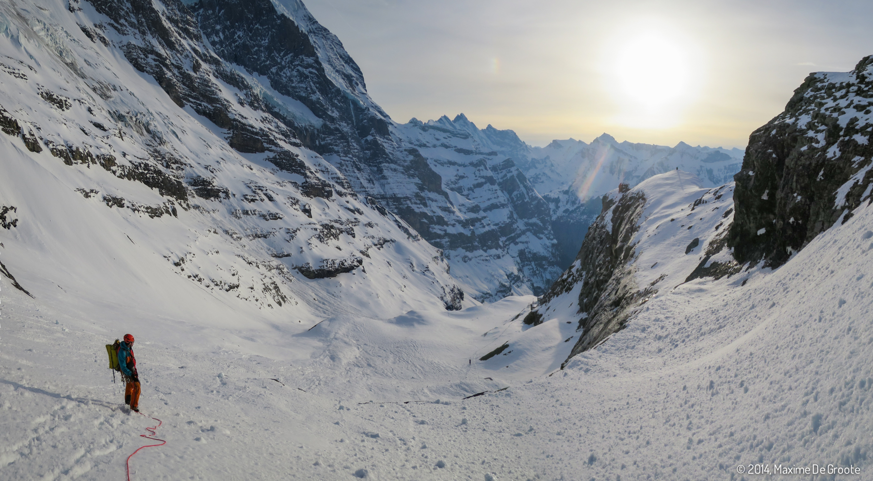 We slapen nabij het Eigergletsjerstation, en zetten onze wekker op 3uur ‘s nachts. Een kort ontbijt, een eenvoudige aanloop en iets voor 5 uur doen we onze stijgijzers aan onderaan de wand. Rechts van een markante rotspijler starten we onze beklimming. Het eerste deel van de route loopt zigzaggend via een 50° sneeuwhellingen omhoog. Hoewel we wel vaker vloeken als er een touwgroep voor ons zit is het nu best aangenaam, de 3 voorgaande cordées hebben immers een goed spoor gelegd. We vorderen zo snel mogelijk zonder ons in het zweet te werken. Simulsolo beklimmen we enkele kortere rotspassages. Als we ter hoogte van het Stollenloch, (een raampje in verbinding met de treintunnel door heen de berg ) komen, staan we voor de eerste serieuze rotsrib en binden we ons in.