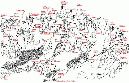 Karavshin it would be. Maar daarmee was de kous niet af. Alle mannen van MC4 (Lander Beckers, Quinten Mattens, Nicolas Mys en Niels Schouteden) zijn studenten, dus in mei en juni was er al geen sprake van enige voorbereiding en bovendien werd de periode waarin we konden gaan beperkt door mogelijke herexamens. We kopen uiteindelijk (goedkope) vliegtickets tussen 13 juli en 15 augustus 2013. Het allergrootste probleem was het gebrek aan informatie over de te beklimmen routes en toppen. Op zo’n momenten is het internet een bos waardoor je de bomen niet meer ziet. Enkele foto’s van de vallei geven wel een “wouw” beeld: die berg of wand roept gewoon om beklommen te worden! Omdat ik voor het werk nog twee weken in Chamonix was vlak voor ons vertrek, bracht ik samen met Lander en Nicolas een regenachtige namiddag door in de bibliotheek van het ENSA. Daar vonden we een hoop verslagen van eerdere expedities, vooral in het AAJ. Aan de hand van hun verhalen kregen we een idee van de mogelijkheden, maar meer dan wat foto’s met mogelijke lijnen vonden we niet. Het was zelfs al moeilijk om uit te maken welke berg of top precies waar lag. Slechts enkele westerse klimmers hebben zich in deze vallei gewaagd, praktisch allemaal bekende namen, gesponsorde expedities van enkele toppers. Verder bleek het de speeltuin van de Russen en Ukrainers te zijn, die er regelmatig hun waanzinnige klimcompetities houden. Hoe maffer, gekker en gevaarlijker hun beklimmingen, hoe beter… We vinden wat info over hun routes, die de Russische quotering 6A hebben: ooh, een 6-aake ;-)