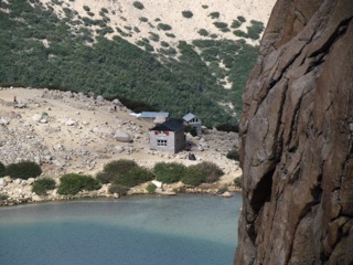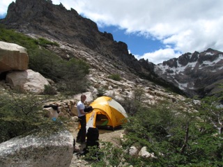 De tenten uit de magazijnen van Ak-Sai blijken derde keus te zijn, maar we slagen erin om uit de verschillende pakketten een aantal tenten op te zetten, we gebruiken onze eigen tenten ook maar, zodat iedereen een slaapplaats vindt. Door wat gesprekken met de Britten en de Russen, blijkt dat het hier al weken aan het regenen is en dat het goede weer vandaag met ons is aangekomen. ’s Avonds wordt het kamp ingewijd en we drinken op goed weer met een glaasje uitstekende wodka, waarvan Viktor blijkbaar een aanzienlijk voorraad bij zich heeft. “First day, hard work. Drink wodka now”. Desondanks de wodka, gaan we ’s avonds nog op verkenning hogerop in de vallei. Vanuit BC kunnen we alleen maar Yellow wall zien en het topje van Pyramidalny. Na een half uurtje stappen zien we ook de majestueuze wanden van Asan en P4810 liggen. We proberen al wat approchekes te ontdekken en een lijn op Little Asan. Het graniet ziet er goed uit en we zien verschillende veelbelovende barsten (cracks).