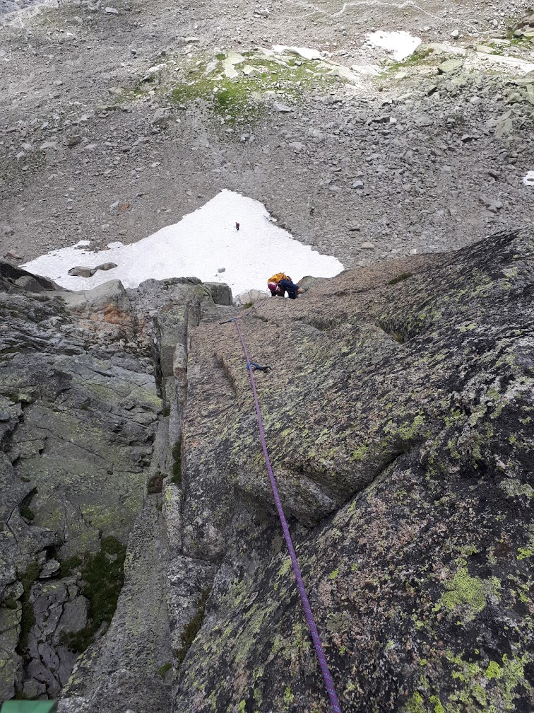 Het oog van Pieter viel meteen op een klassieker; Frendo spur. Een route die alles in zich heeft, behalve een lange aanloop of afdaling. Dit was voor ons zeker niet erg aangezien we al wel een serieuzere portie wandelen achter de rug hadden van de week er voor. De route begint met een uurtje wandelen vanaf het midden station van de lift die naar aguille du midi gaat en de route eindigt bovenaan deze lift. Omdat we al een hele nacht hadden gereden leek het ons verstandiger om de lift al naar boven te pakken, maar daar eerst nog te slapen en pas ’s nachts ergens te vertrekken naar onze route. Een goede beslissing want met alle corona maatregelen moesten we 2 uur wachten op onze lift naar boven. Om de dag dan toch nog zinvol in te vullen besloten we nog te gaan multi-pitchen. We kozen voor Aiguille du Peigne : Face W des Papillons – Le Lutin des Neiges. Een route die start met een 6b, gevolgd door een 5c, een 3 om een grasveld over te gaan, dan nog een 6a en 3x 6b. Het graniet was moeilijker dan ik eerst had verwacht en het vertrouwen op mijn voeten was er totaal niet. Dit maakte deze beklimming een stevige uitdaging. Door het late vertrek uur waren we ook pas tegen 20.30 terug aan het bivak. En was het al donker voor we allemaal in onze slaapzak lagen. Een klimprestatie die een beetje tegensloeg was mentaal zwaar. Gelukkig zou het morgen makkelijker zijn. De Frendo zijn zwaarste stuk is 5C. Met een rugzak en D botinnen weliswaar…
