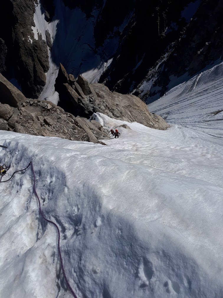 Boven deze sneeuw is pas de echte kers op de taart. Een sneeuwhelling van 65 °, welke onder de zon is veranderd naar een ijshelling van 75°. Het was al snel duidelijk dat we onze ijsbijlen zouden nodig hebben. 75° stond er op de topo. Het leken mij er wel 85°. De ene zag er hier al wat meer naar uit dan de andere, maar we moesten er eender hoe over. Na onze goede rotsklimtechnieken is het contrast met de ijsklimtechnieken schrijnend. Van al het vlotte klimwerk schiet hier nu niets over. We zijn onzeker, onze kuiten verzuren bij iedere stap die we zetten en het ijs is zeer veranderlijk en soms bikkelhard. We kunnen maar amper traverseren en de cordee onder ons, van Pieter en Brecht, krijgt vaak de volle laag. (sorry guys) De helling is maar 80 meter volgens de topo maar 3 uur verder is iedereen het beu. We zien een gids ons langs onder voorbij spurten met een klant, haakafstanden die wij niet durven maken. Onze vijzen (we hadden er maar 4 per cordee) worden vaak na 5m en 7m al gedraaid. Dan moeten we al relais bouwen en vorderen dus echt in slow motion. Extra: sinds de sneeuw graat klim ik weer op kop, nu even mentaal sterk houden en blijven gaan. Bavo is stilletjes aan het afzien en leert ondertussen bij dat een ijsbijl met een sling een welkom rustpunt is. Ik zie wat rots en denk: “Hier moet ik zijn. Ik wil rots onder mijn voeten en ik wil zitten!” Ik ben duidelijk niet de enige die dat denkt. De rest volgt me maar al te graag. En wat een geluk, iets verder op de rots is een perfect plekje om met 4 te gaan zitten. We kunnen hier in de zon zitten en even genieten van een zware dag. Na een half uur rust zijn we weg en blijkt dat we 15m verder al boven zijn. We zijn allemaal moe, de dag was zwaarder dan we hadden verwacht en we missen nog een groot stuk vertrouwen op het ijs. We moeten hier nog duidelijk aan verder werken. Toch blij dat we dit hebben gedaan, vertrekken we naar een bivak plaats in de buurt van ârete Cosmique. Iemand van ons is jarig en dat wordt in het bivak dan ook zo uitbundig mogelijk gevierd. Er is dessert voor iedereen en zelfs een slokje whisky! Tevreden kruipen we allemaal op tijd in onze warme slaapzak.