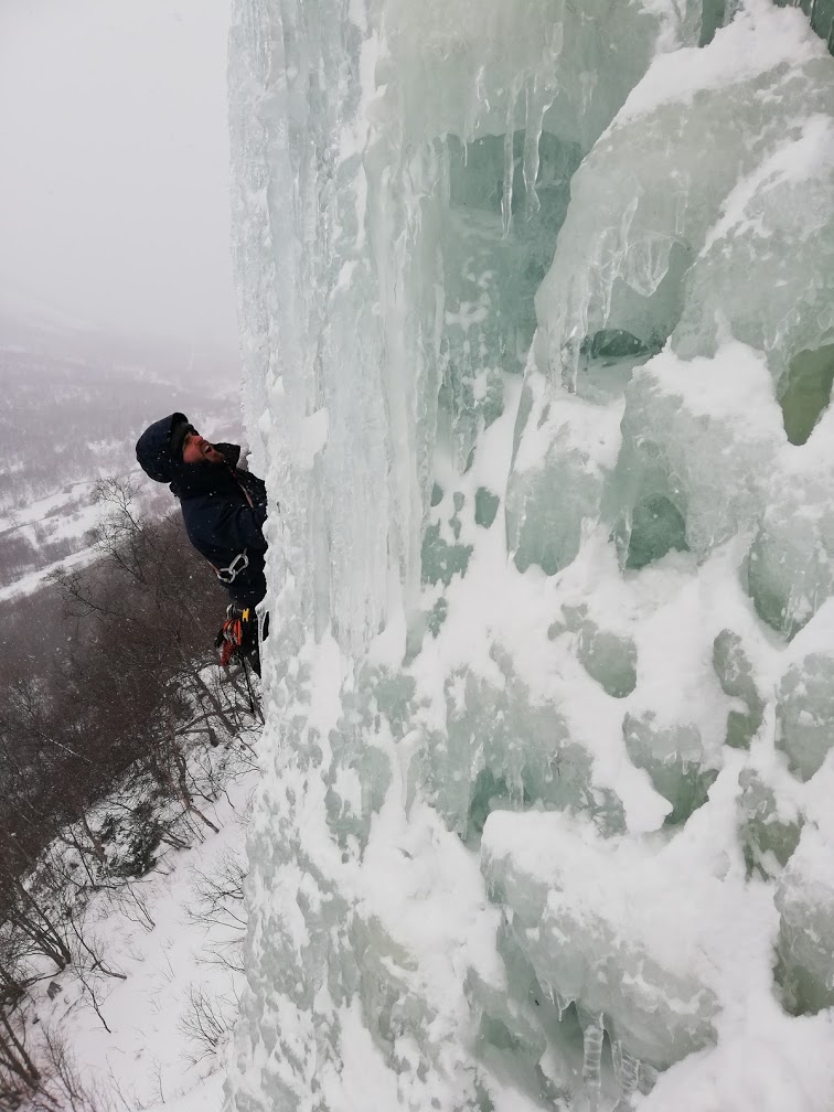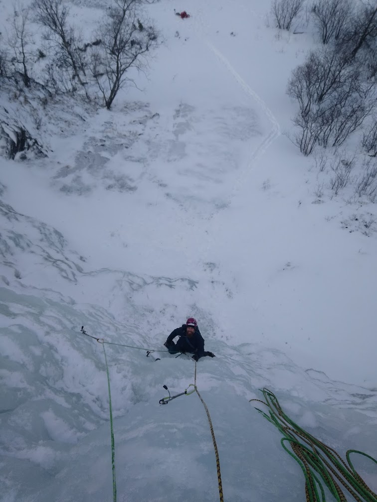 Stilte voor de storm. Het is zo’n 10°C onder nul. De eerste dag gaat van start met uitleg over hoe we onze crampons goed moeten gebruiken in het ijs. Daarna leren we hoe we met de juiste slagtechniek onze ijsbijl in het ijs kunnen hakken. Als we het op de grond wat onder de knie hebben, mogen we vertrekken in de hoogte. De eerste lengtes doen we toprope, en om duidelijk te maken hoe belangrijk voetenwerk is bij ijsklimmen, moeten we de bijlen beneden laten. Na de eerste lengte maken de meeste onder ons kennis met de “screaming barfies”. Dit is de omschrijving van pijn die je voelt als je afgekoelde handen plots terug hard beginnen op te warmen. Wat een helse, ongemakkelijke pijn! Je weet niet wat je overkomt, kan er niets aan doen en wil beginnen roepen ook al weet je dat dit niets gaat uithalen. Gelukkig is de pijn na een tweetal minuten weer verdwenen. Ook al leek de tijd op dat moment wel even stil te staan. De tweede dag gaan we over naar het leren plaatsen van ijsvijzen. Wat is een goede plaatsing voor mijn vijs en waar moet ik op letten. Op het einde van de dag klimmen we ook onze eerste routes voor. Allen op gemakkelijke stukken (WI3).
