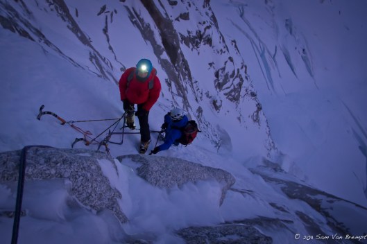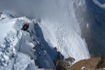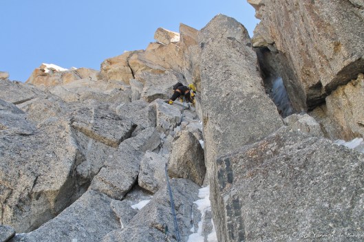 De M5 lengte was een stevige knakker waar Maxime toch vlot een uur en een kwart voor nodig had om ze te ontcijferen. Gelukkig was alles goed af te zekeren, maar M5 was gezien de omstandigheden toch iets te zacht uitgedrukt. De volgende lengtes bleken helemaal verstopt te liggen onder de losse sneeuw, dus kuisen maar. Na nog een drietal ‘funky’ lengtes kwamen we net onder de moeilijkste passage van de Arrête de Cosmiques. Ondertussen was het weer ook al wat omgeslagen en kregen we zowaar nog een pak verse sneeuw over ons hoofd.