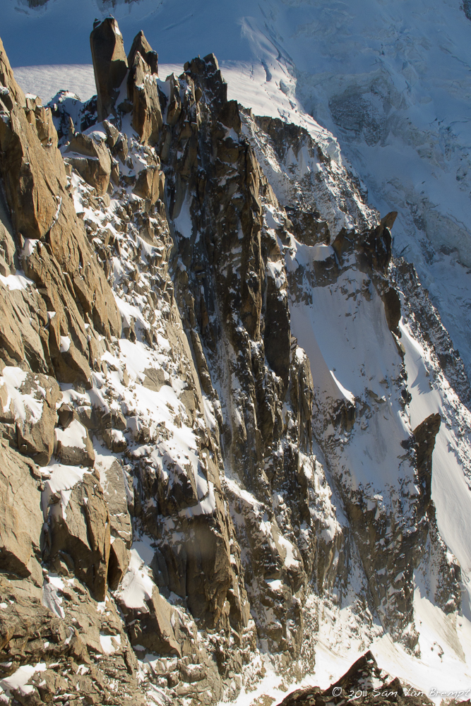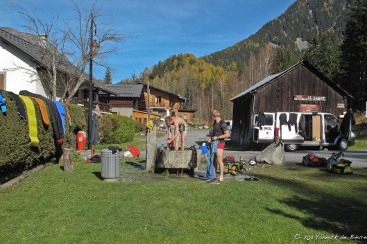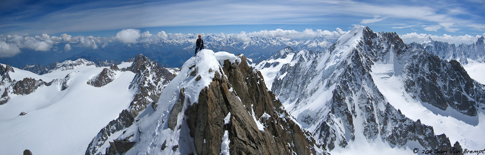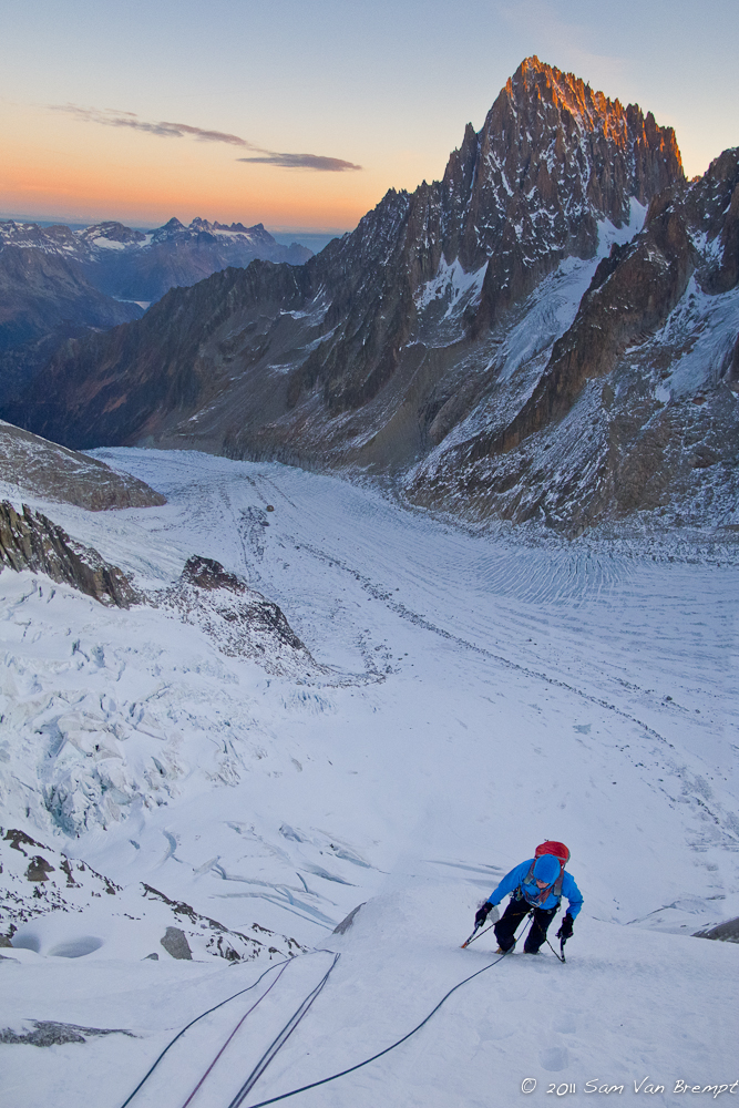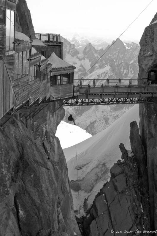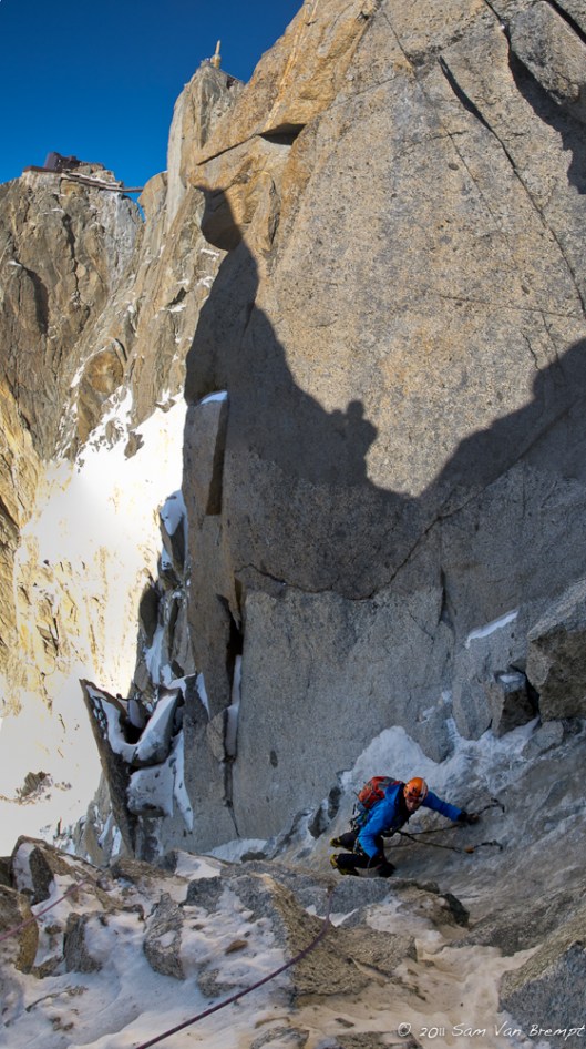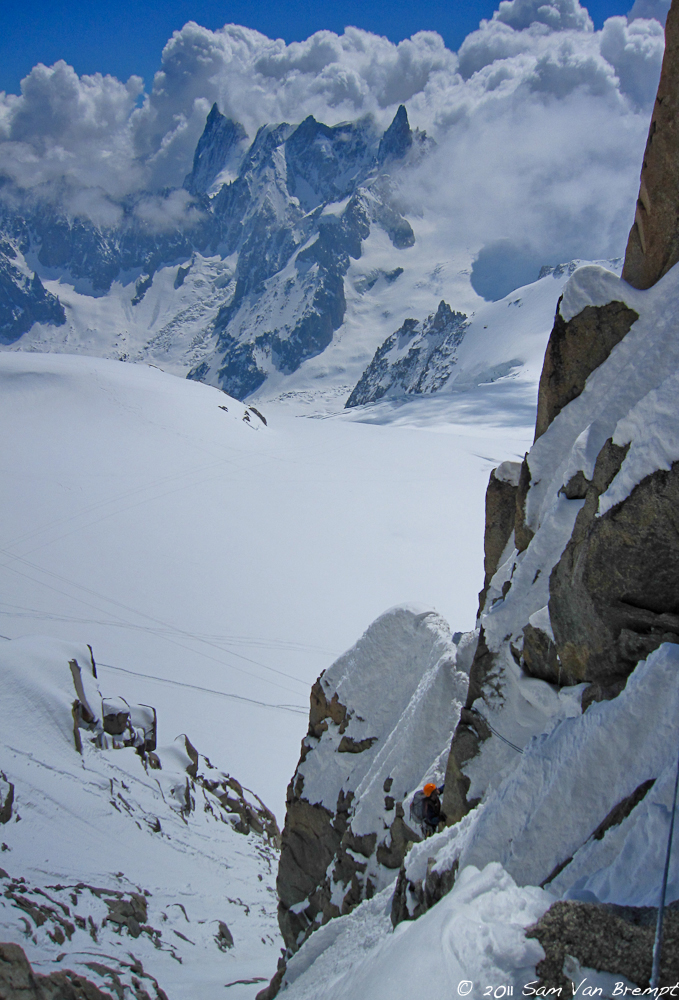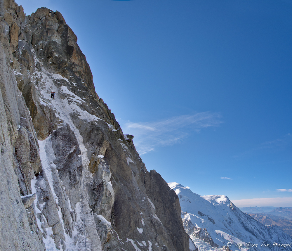 Om wat te acclimatiseren en de condities te bekijken besloten we de week te starten met een route vanaf de Aiguille du Midi. Alle andere liften waren toe, dus dat vereenvoudigde de zaak. Na een leuke ontmoeting met Christophe Profit die ons nog herkende van Khan Tengri en eerdere bezoeken in Chamonix was het tijd om te starten.