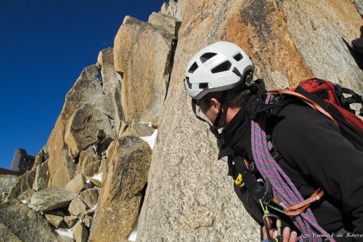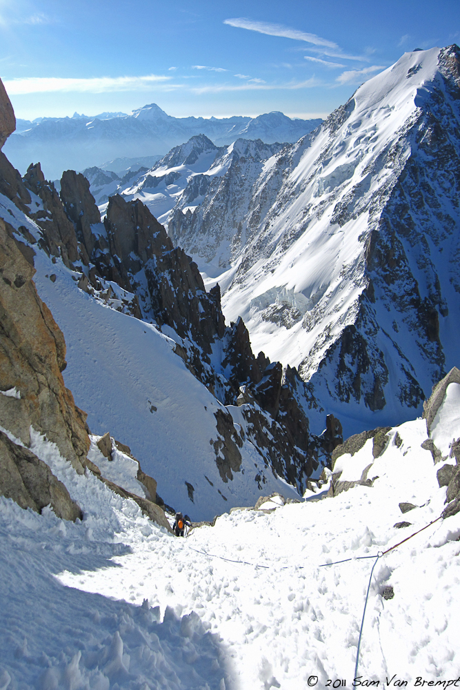 Ook vandaag ging het klimmen ons goed af. Lekker weertje, mooie uitzichten, geen volk in de buurt en fantastisch mixte klimmen. De top lieten we voor wat het was. De Mont Blanc du Tacul afstappen is echt niet iets waar ik me zonder reden aan wil wagen.