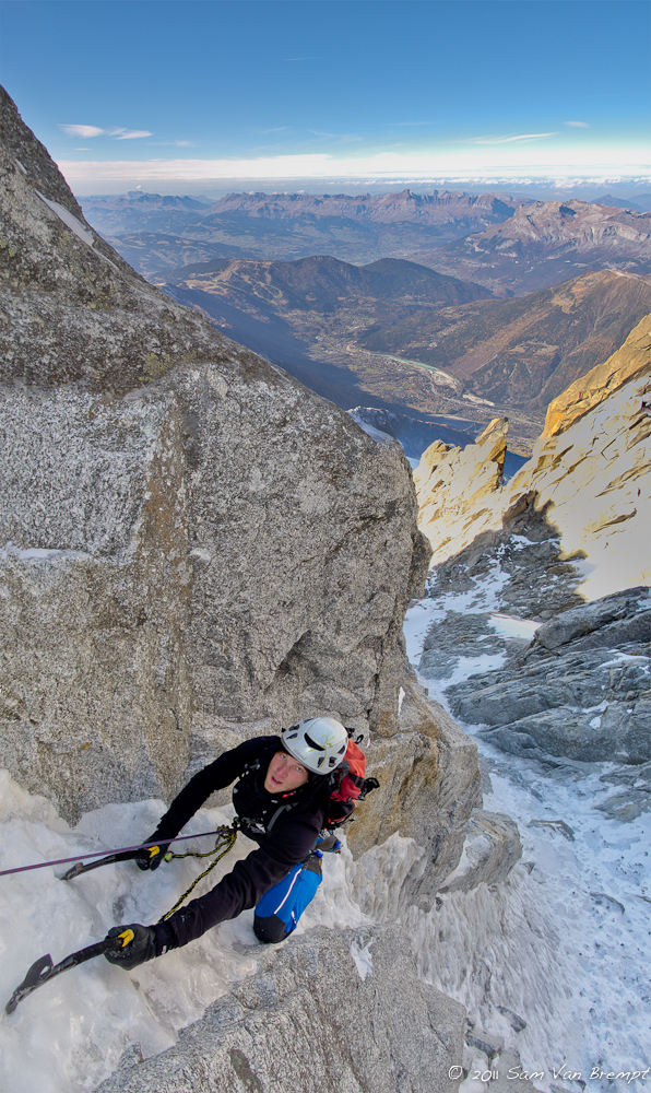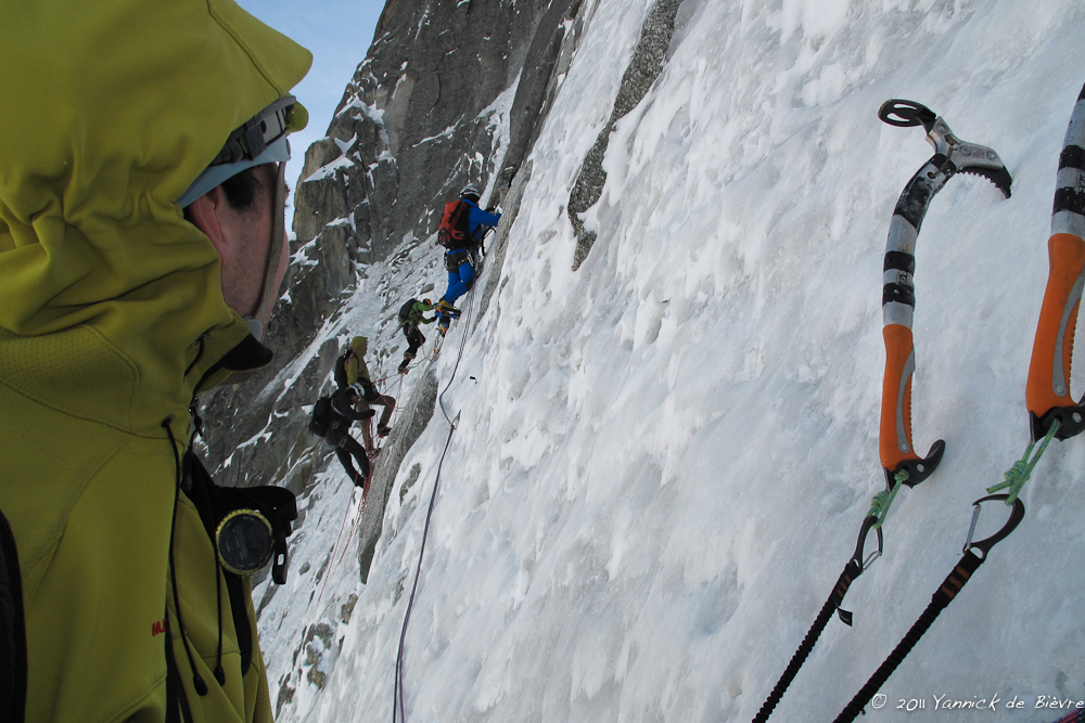 Ons oog was gevallen op de Goulotte Perroux (III/4+/M5 350m). Deze mixte lijn is niet zo vaak beklimbaar, maar vandaag was onze lucky day. Om nu te zeggen dat er ijs in overvloed was is wat overdreven. De eerste 4 lengtes hingen de ijsvijzen maar hulpeloos aan onze gordel te bengelen. Friends en nuts waren onze beste vrienden.