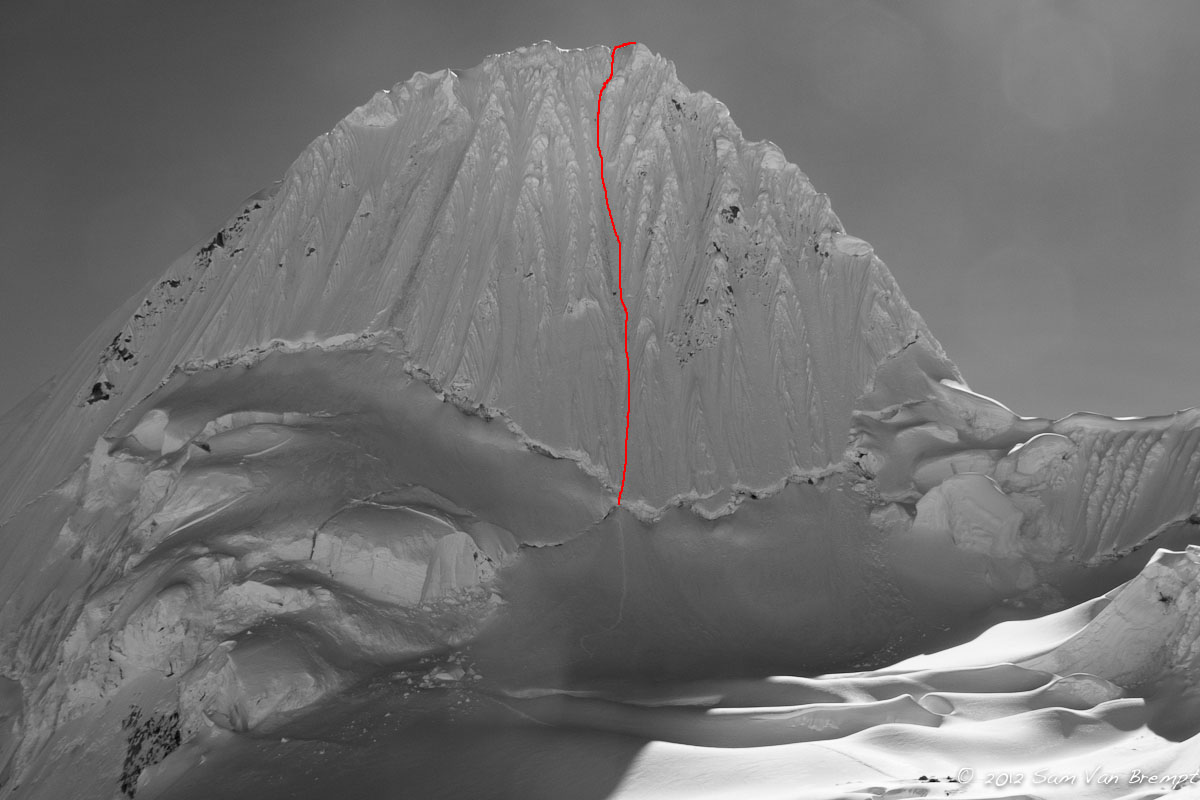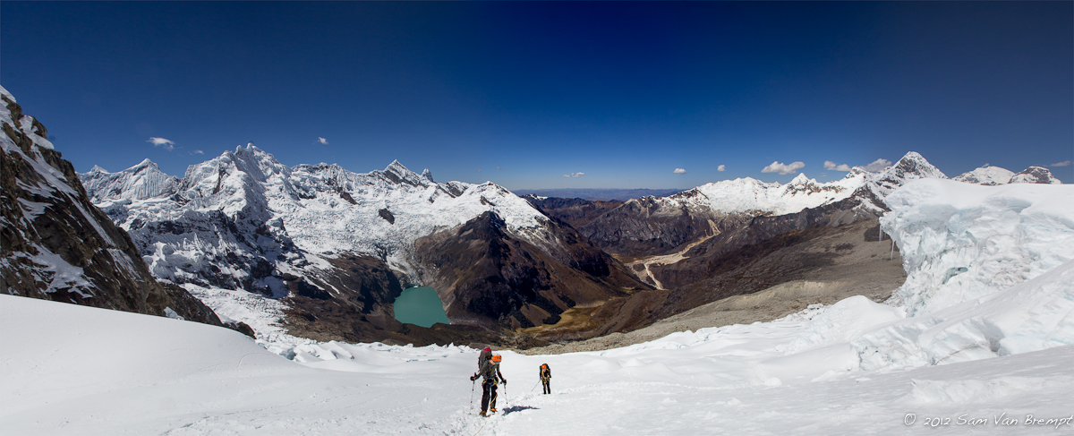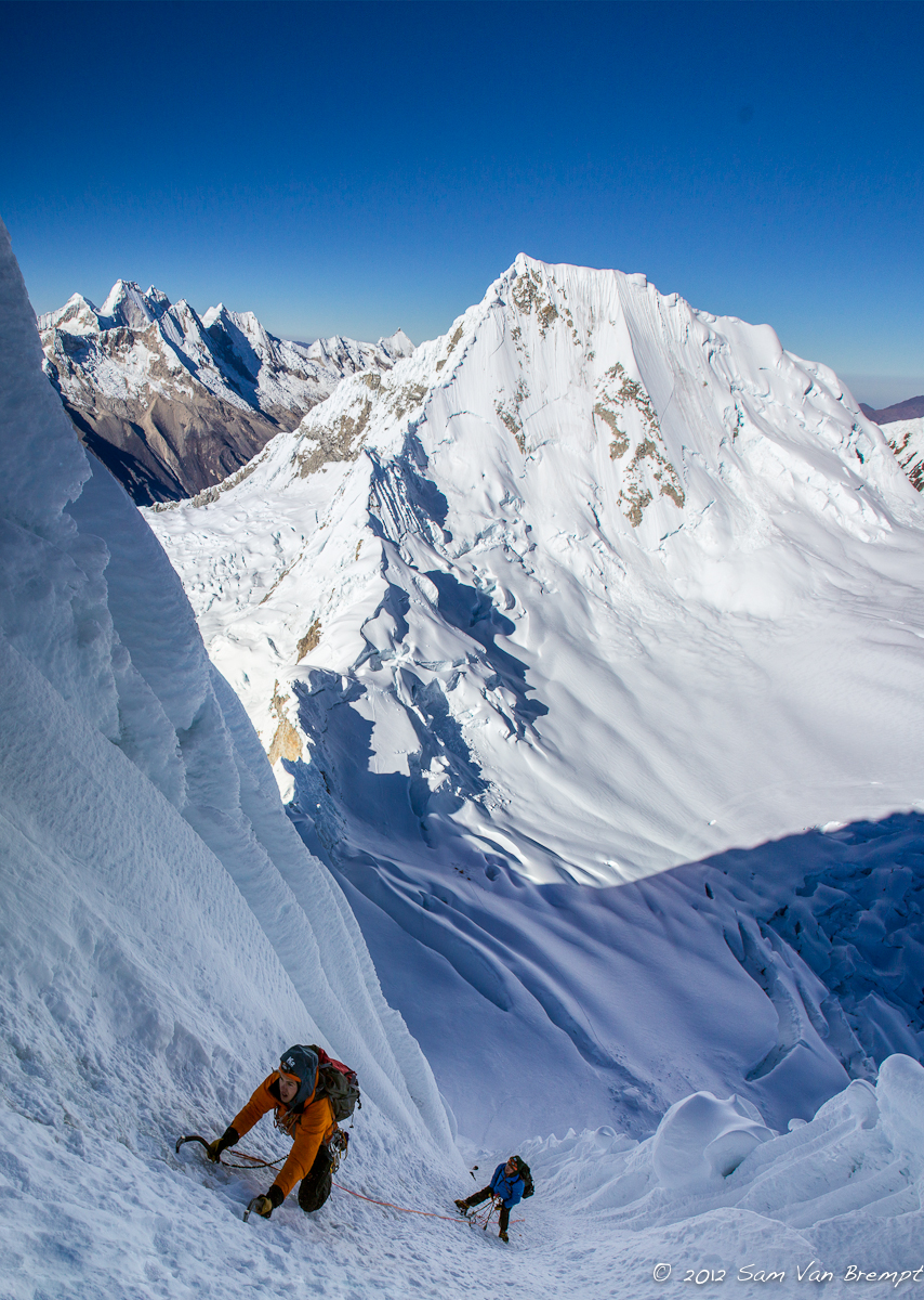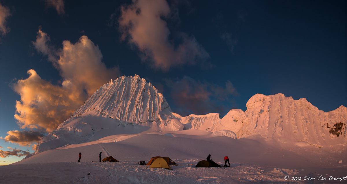 We stijgen op ons gemak in naar Alpamayo (5947m), met maximum 600hm per dag, en beklimmen de prachtige zuidwest wand de Ferrari route. Voor ons lijkt dit aanvankelijk een gewaagde onderneming, met een behoorlijk grote kans om hoogteziek te worden. Echter, Sam voegt eraan toe dat hij van de trip een klein filmpje zal maken… Iedereen die bekend is met de films van Sam beseft goed genoeg wat een eer en genoegen dat is, en al snel krijgt hij ons overtuigd en zijn de zakken gepakt.