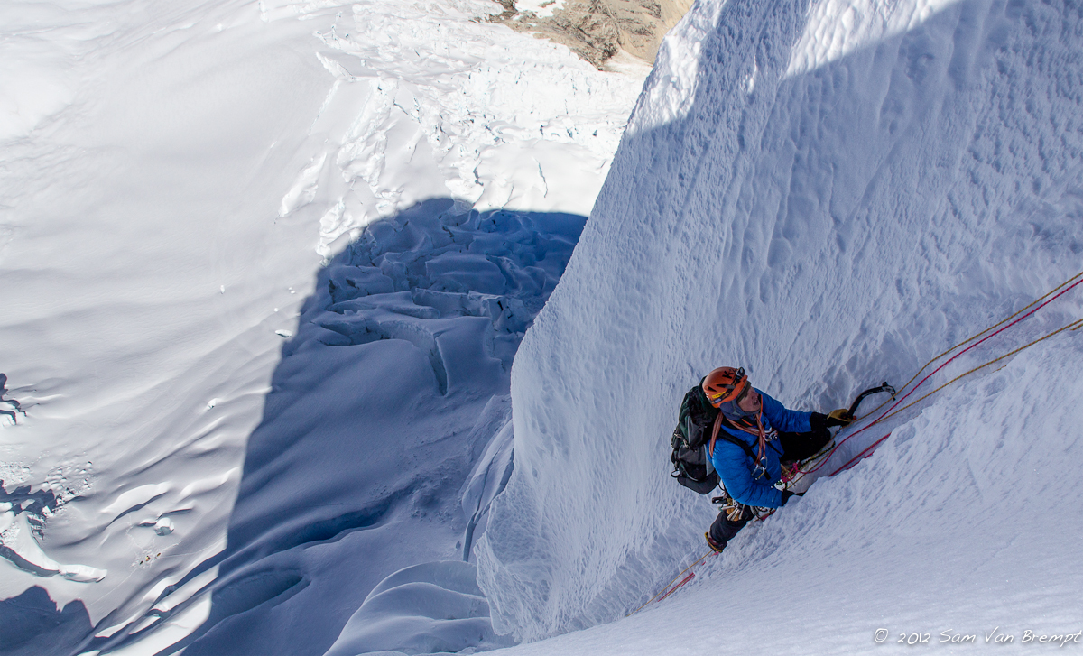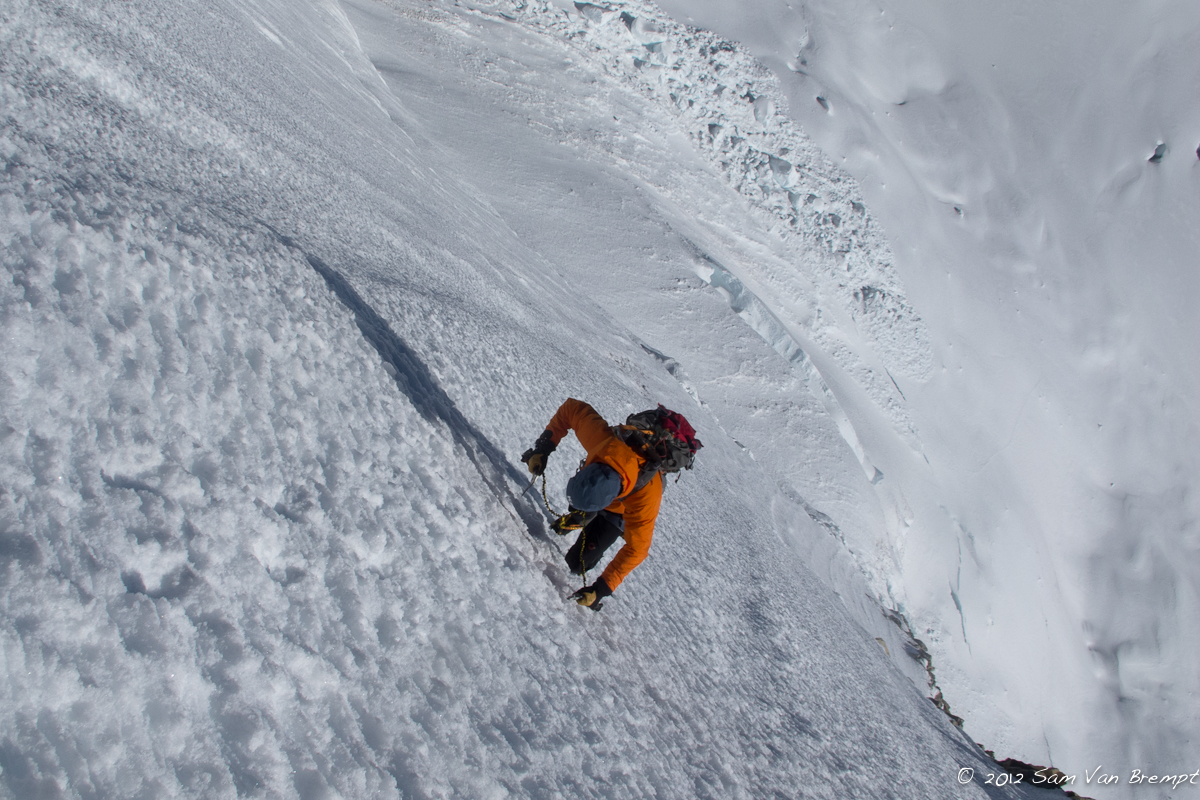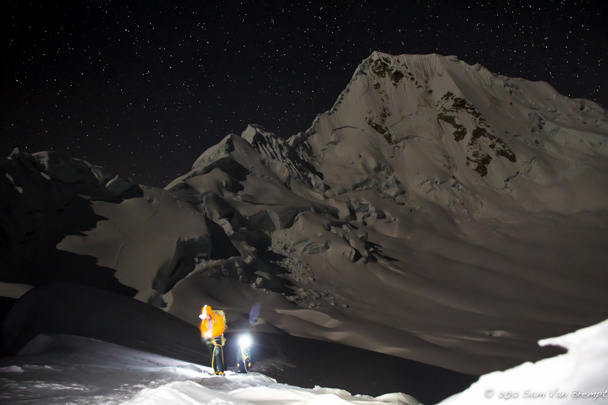 Om 4u vertrekken we en na een half uurtje staan we aan de bergschrund. Ikzelf heb nog geen last gehad van hoofdpijn, echter de hoogte speelt wel een rol op mijn appetijt en darmflora. Een acute krampaanval zorgt ervoor dat ik onderaan de wand, in een behoorlijk oncomfortabele positie, nog snel even mijn behoefte moet doen. Vol empathie geeft Sam er enkel om dat ik zijn touwen niet bevuil, en beslist tot mijn groot jolijt nog om een foto van mij te nemen…