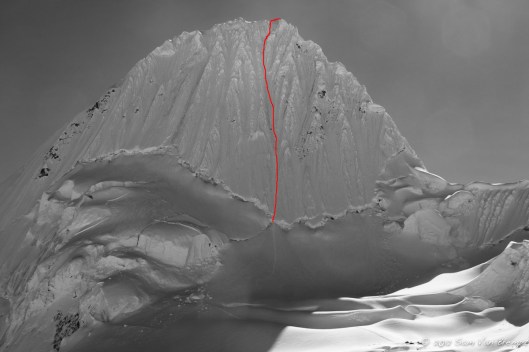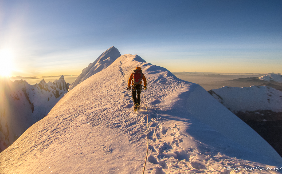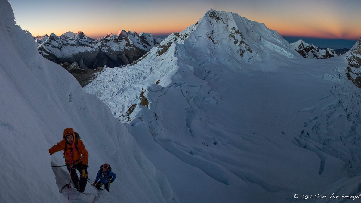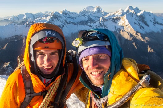 Na enig zoekwerk naar een goede plaats om de rimay over te steken begonnen Sam en ik aan de wand. Waar we ervoor nog konden omhoog wandelen hadden we nu beide bijlen nodig om onszelf naar boven te werken door steiler terrein. Na een derde van de wand te beklimmen kwamen we bij een tweede, kleinere, rimay die we zigzaggend moesten oversteken. Hierdoor kwamen we op een graat die ons recht omhoog tot de topgraat leidde. Solo klommen we de pente van 50 à 60 graden tot we iets onder de topgraat in losse sneeuw verzeilden. Hier besloten we het touw boven te halen om de laatste 50 meter te klimmen. Een betere timing kon er niet zijn want net als we beide op de winderige graat stonden kwamen de eerste zonnestralen ons tegemoet. We liepen de scherpe, luchtige, graat af tot op de top.