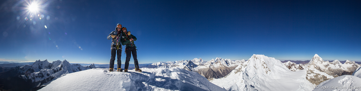 Maxime en Nelson op top van Alpamayo, 270° links de Pucajirca groep, rechts Huascaran, Huandoy groep, Quitaraju en Santa Cruz
