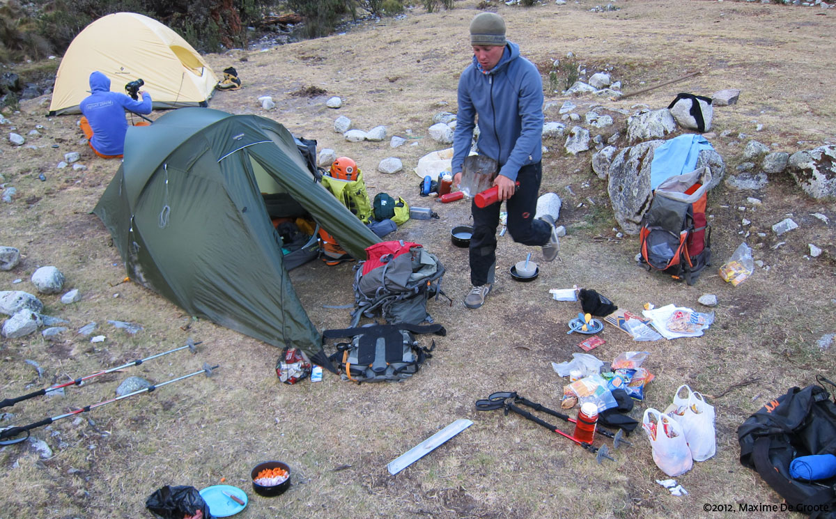Timelapsen en koken in ons rommelig Alpamayo Basecamp (4330m )