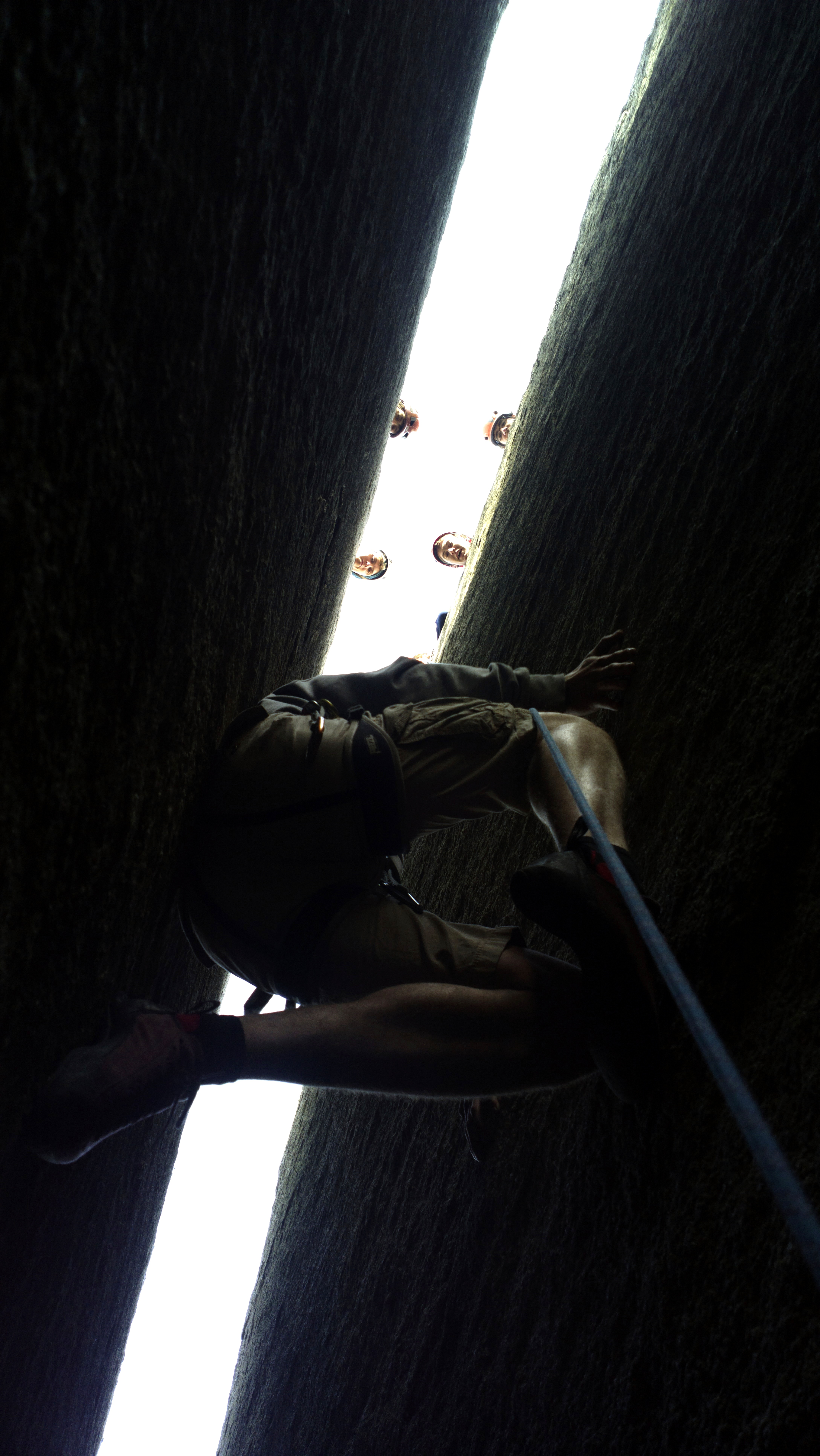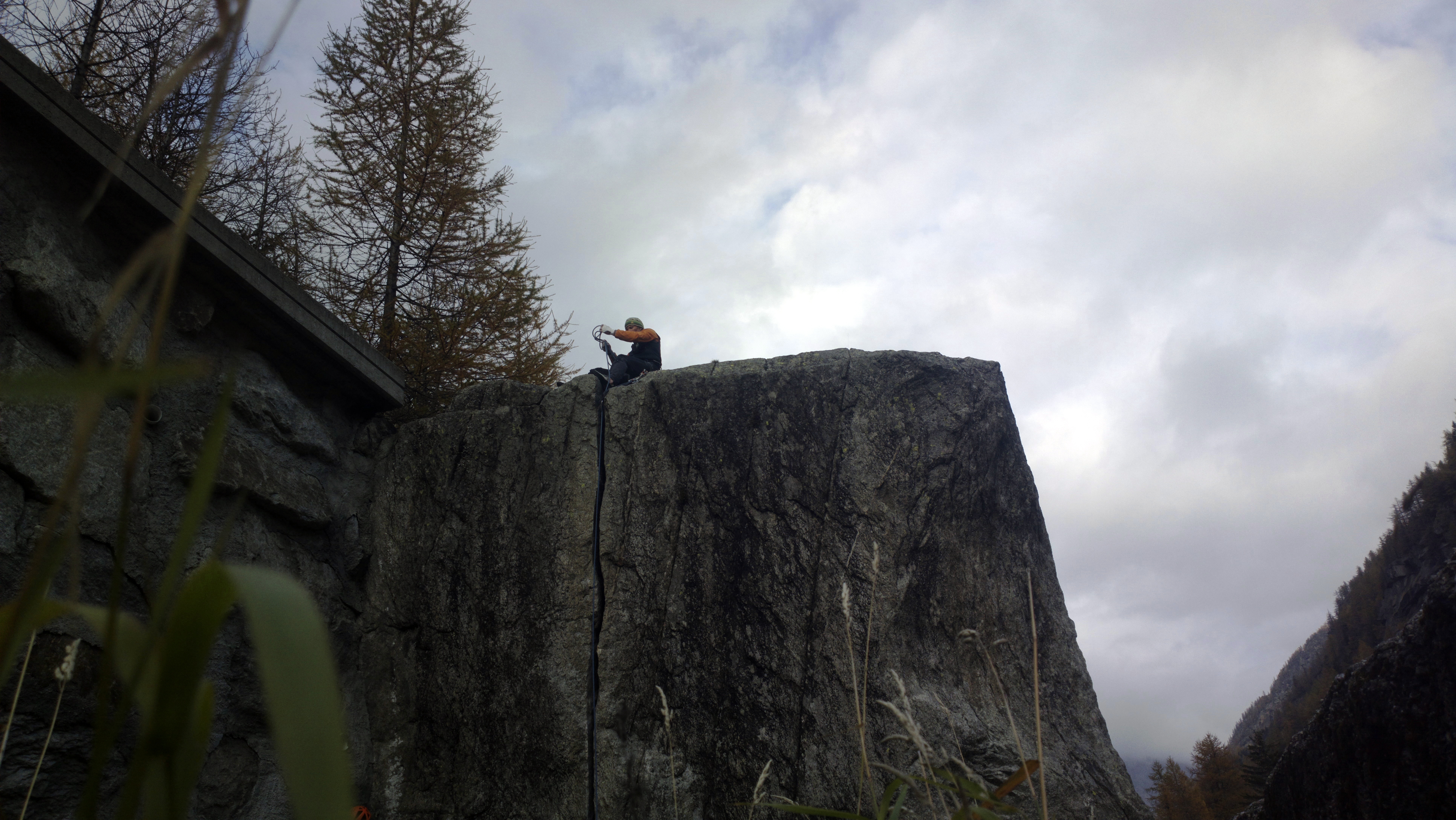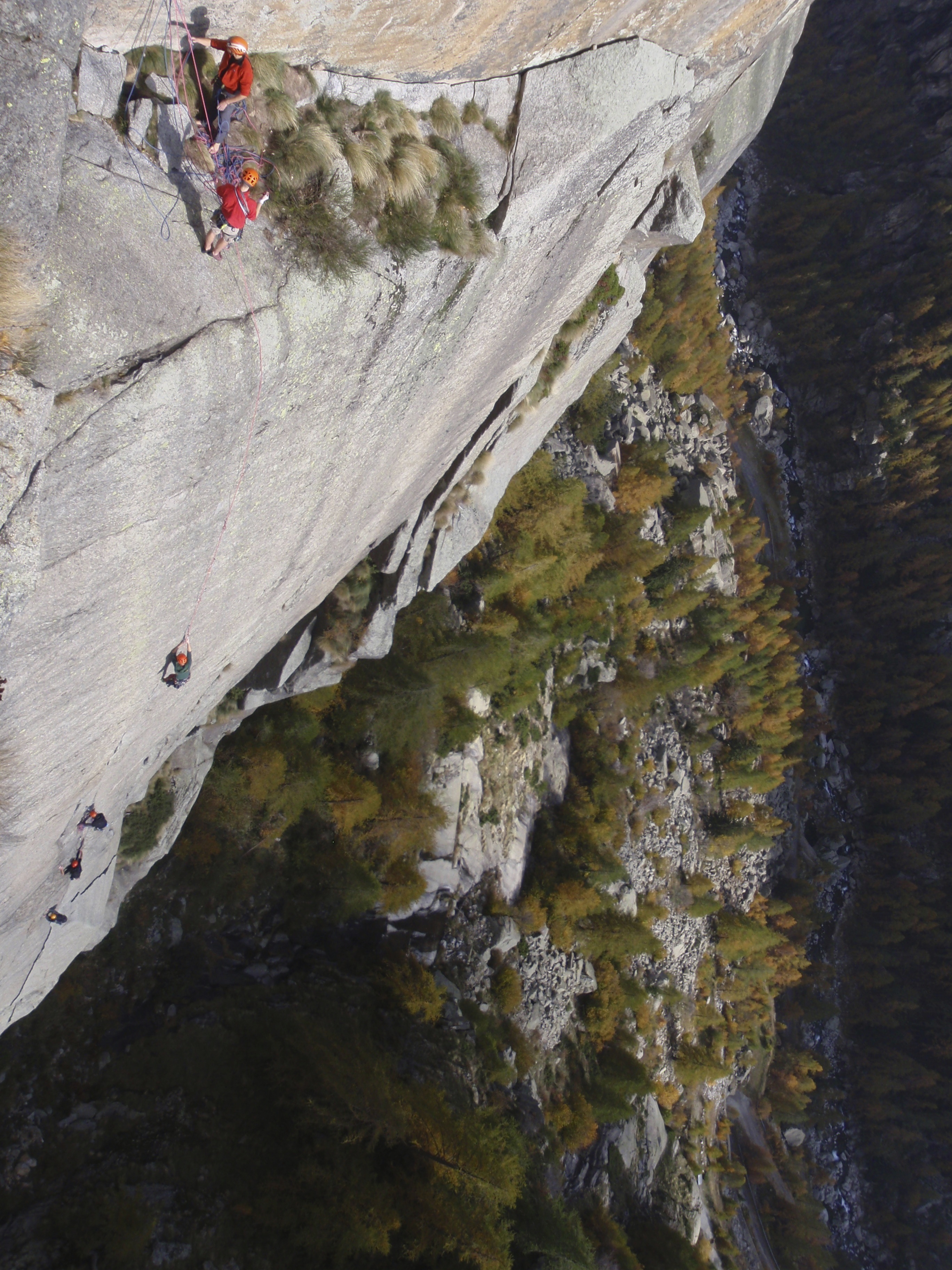 Denis en Kristof klommen in wat Kristof “el misero” noemde. Na veel gepalaver en geschuif in de cordées kwam de rest ook overeen. Andy, Seba en Jeroen klommen de eerste 3 lengtes van “Il lato oscuro” om dan Niels en Friedemann te volgen in de 2e helft van “locatelli”. Deze laatste route was uniek in de zin dat er een korte speleo sectie in kwam. De laatste lengte, een 6b dièdre die er vochtig bijlag werd omgeruild door een 6a barst-dal. Ondertussen kwamen de sluierwolken langzaam vanuit lagere hoogten het dal binnengedreven. Toen de laatste lengte beklommen was, bereikten de wolken ons ook. In de mist rappelden we wat de laatste lengtes van de stage zouden worden. De volgende dag beslisten de weergoden dat het goed geweest was en onze vingertoppen waren er niet rouwig om. Tijd om naar huis te gaan.
