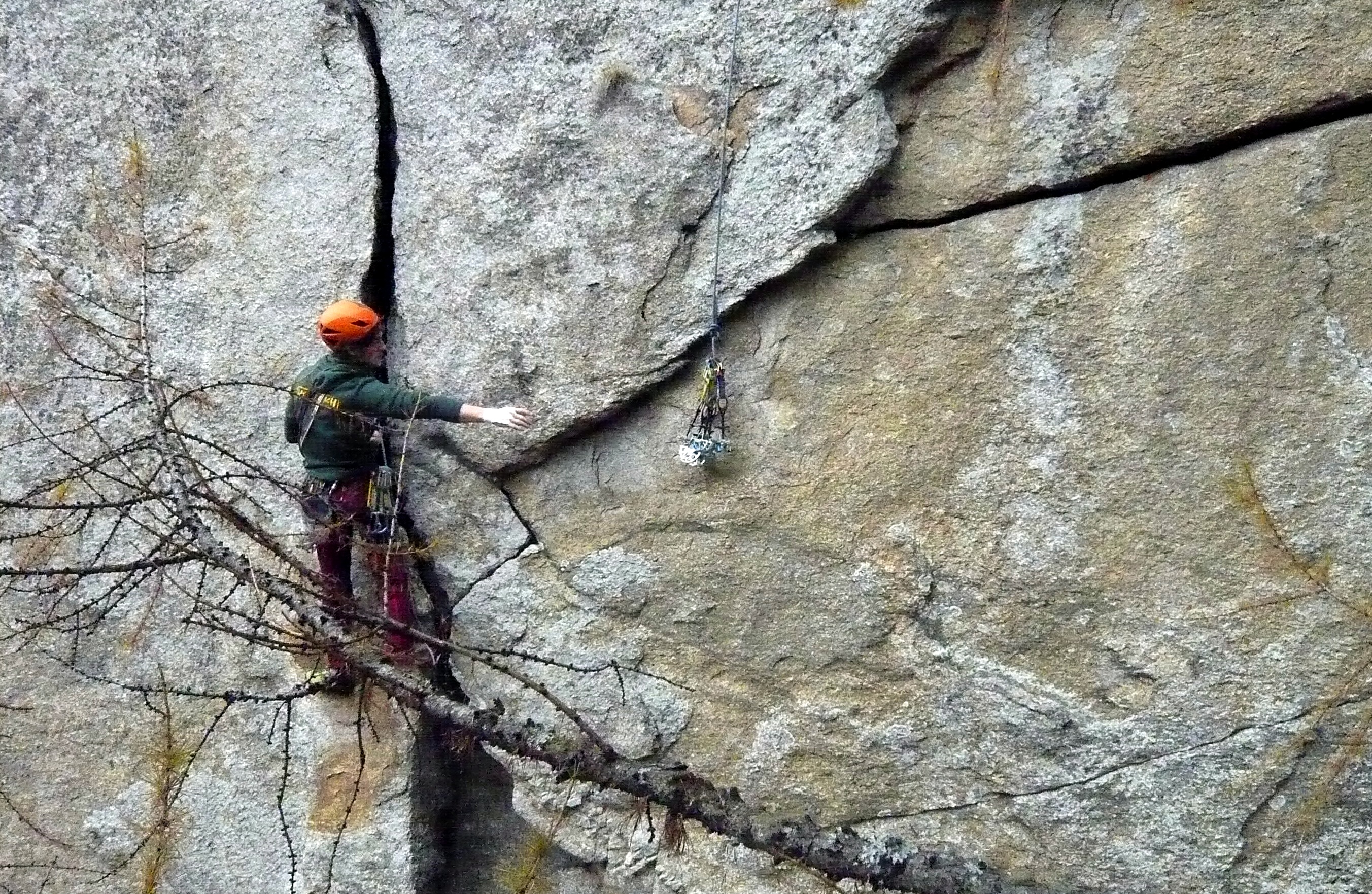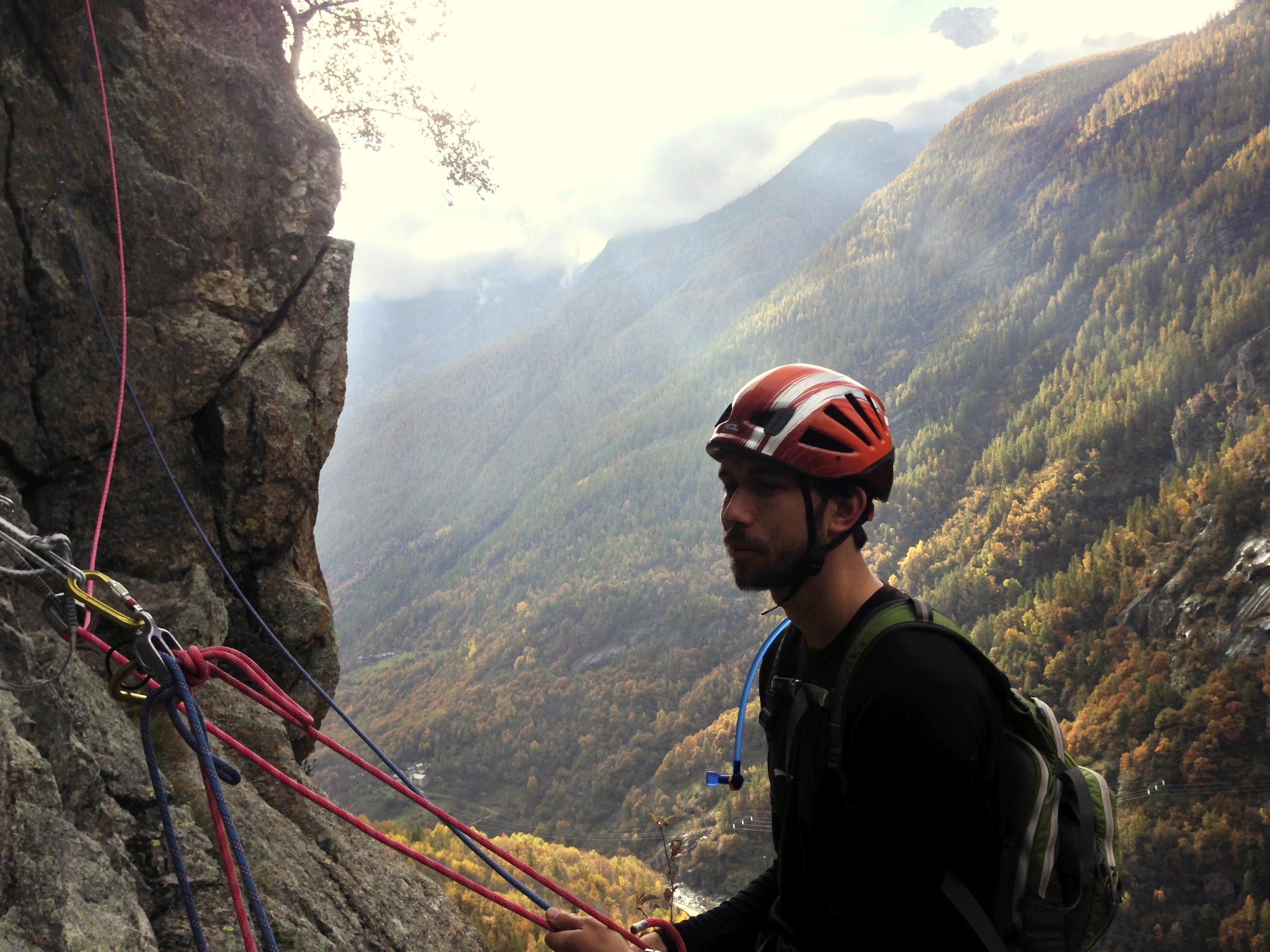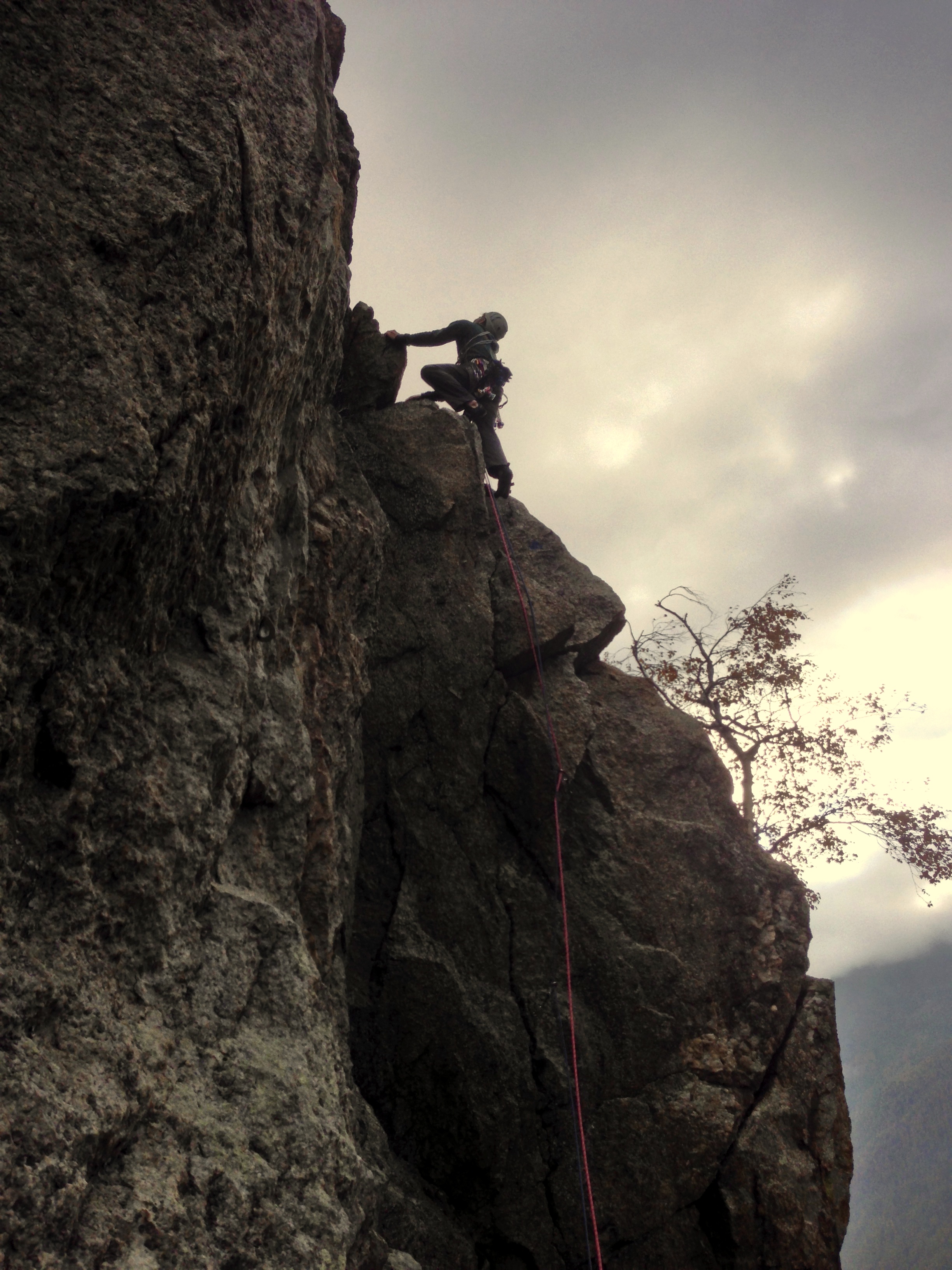Denis en Kristof klommen in wat Kristof “el misero” noemde. Na veel gepalaver en geschuif in de cordées kwam de rest ook overeen. Andy, Seba en Jeroen klommen de eerste 3 lengtes van “Il lato oscuro” om dan Niels en Friedemann te volgen in de 2e helft van “locatelli”. Deze laatste route was uniek in de zin dat er een korte speleo sectie in kwam. De laatste lengte, een 6b dièdre die er vochtig bijlag werd omgeruild door een 6a barst-dal. Ondertussen kwamen de sluierwolken langzaam vanuit lagere hoogten het dal binnengedreven. Toen de laatste lengte beklommen was, bereikten de wolken ons ook. In de mist rappelden we wat de laatste lengtes van de stage zouden worden. De volgende dag beslisten de weergoden dat het goed geweest was en onze vingertoppen waren er niet rouwig om. Tijd om naar huis te gaan.
