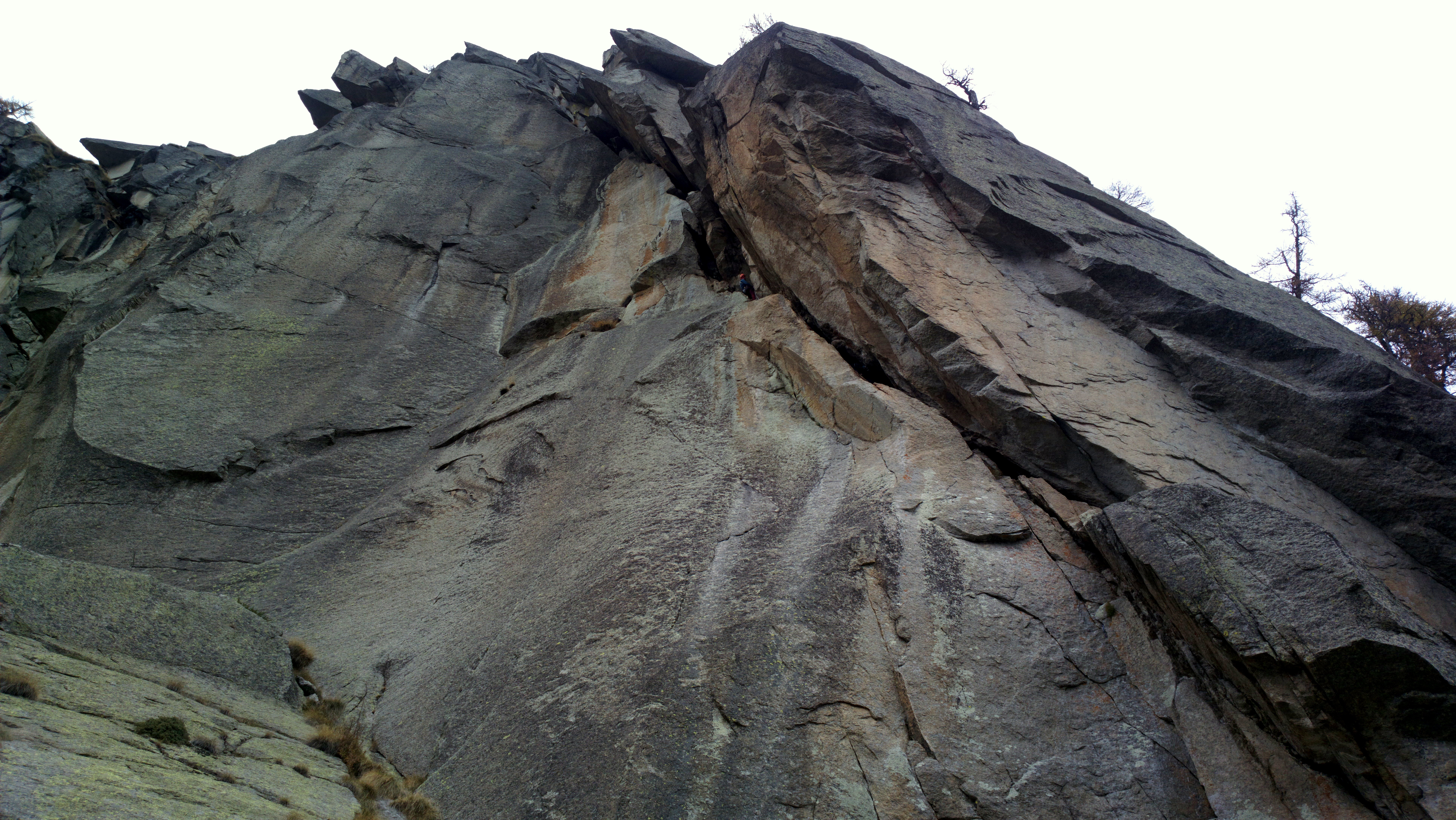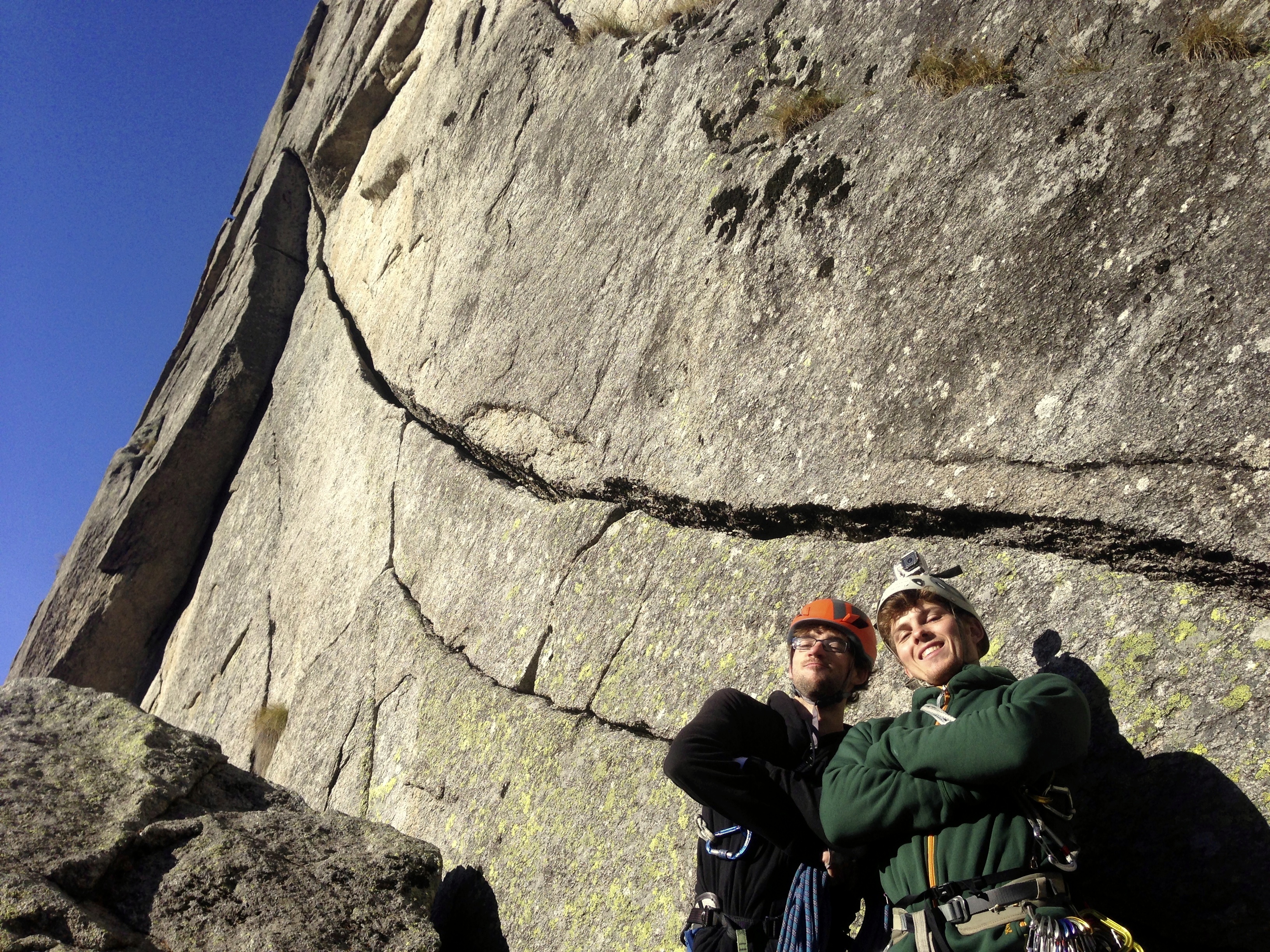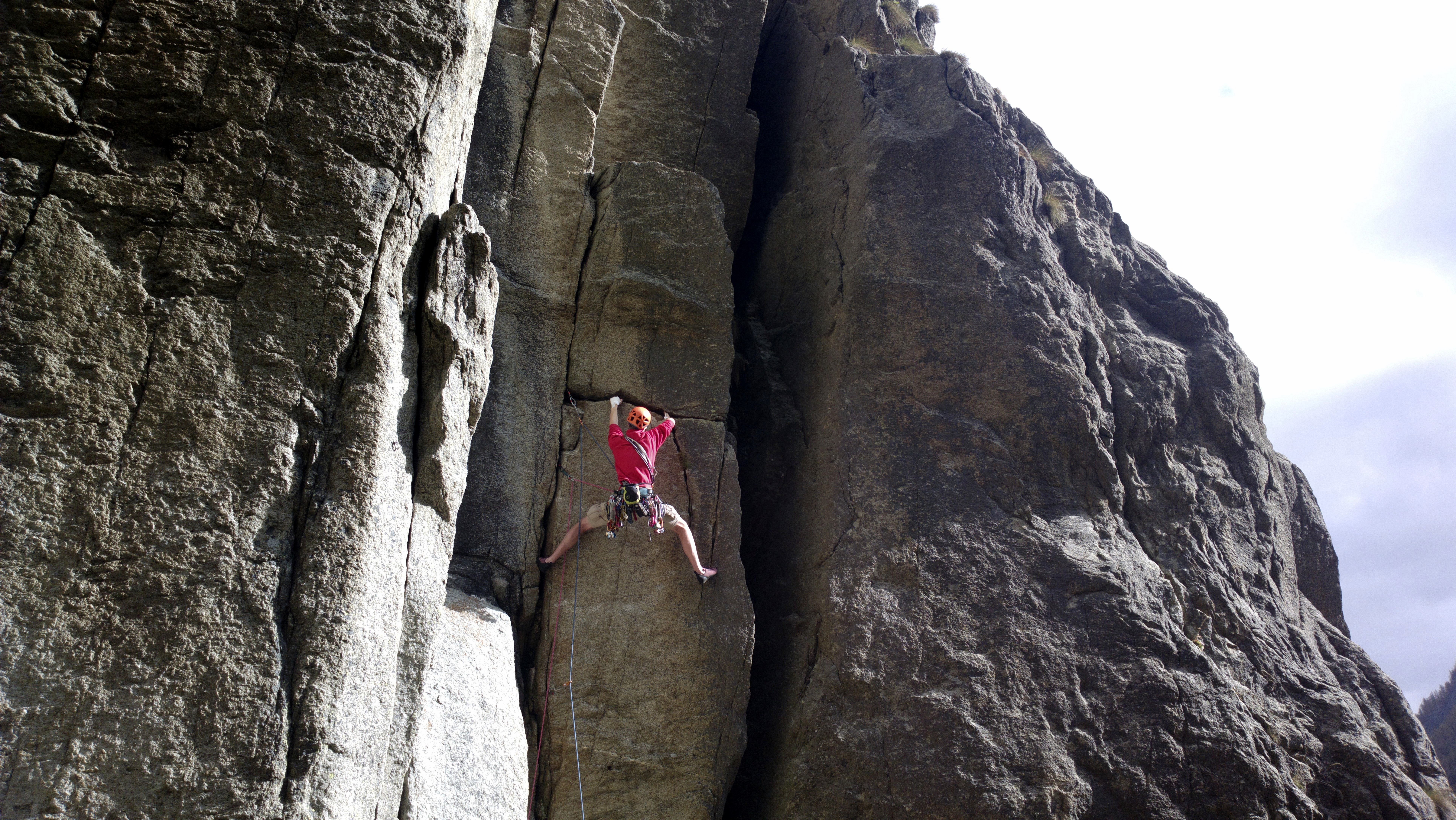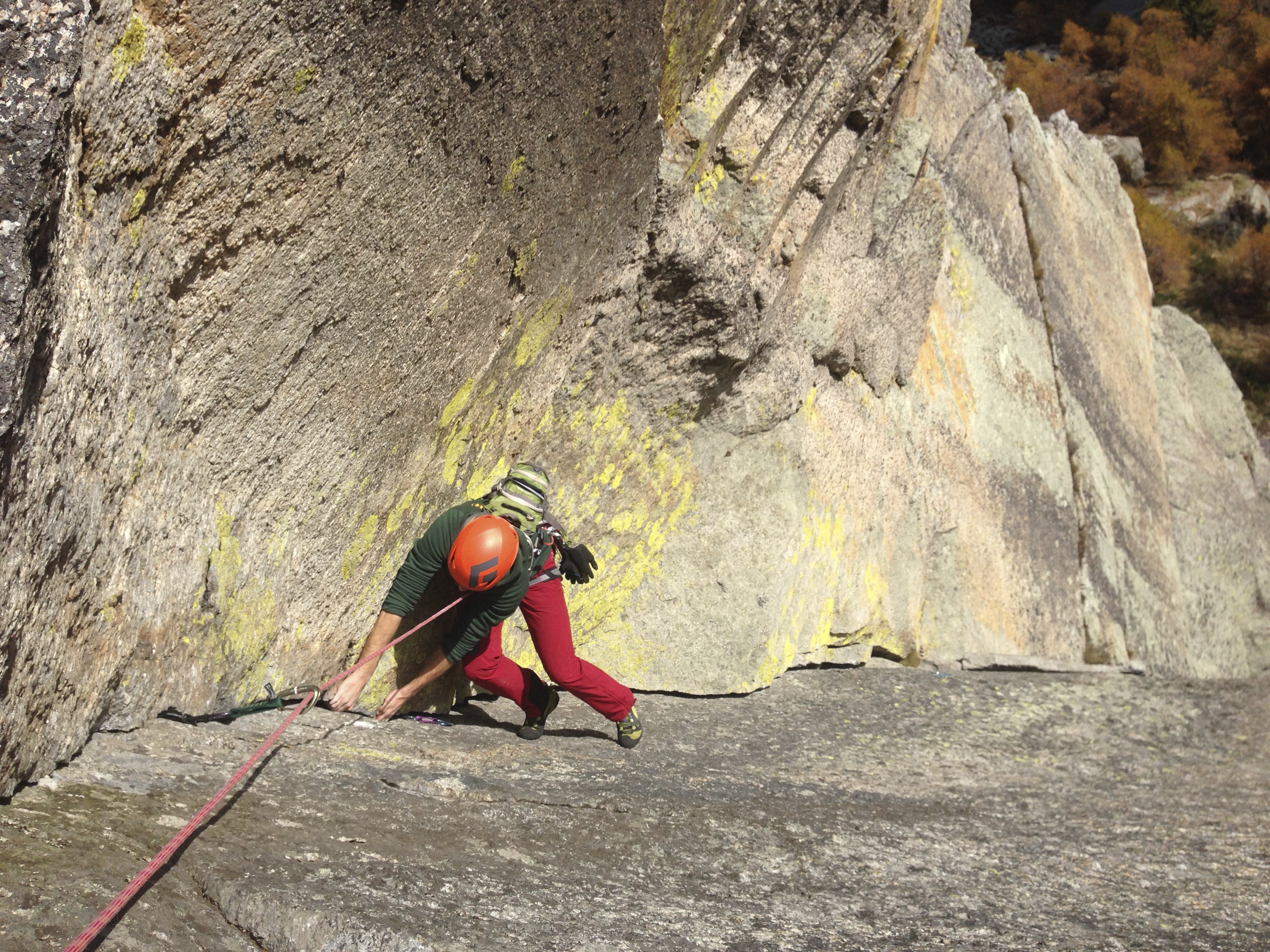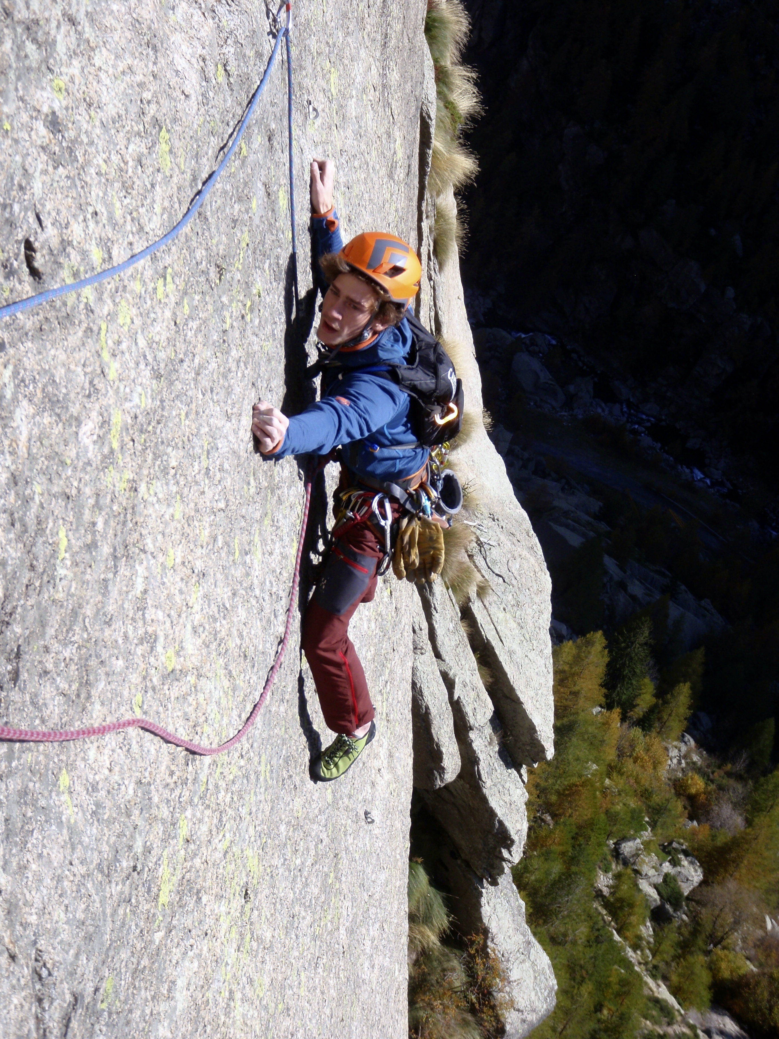 De volgende dag was het graniet niet het enige dat barsten vertoonde: Ook het scherm van Jeroen’s gsm moest eraan geloven. Timelapsen schieten is een gevaarlijke bezigheid. Een goede nachtrust had iedereen deugdgedaan en eindelijk konden we de eerste trad multipitch routes aanvatten. De dag bracht een paar mooie lengtes. Vooral L4 en L5 van “Pesce d’aprile” waren heel plezant. De uitklim van de grot uit L4 van “Spigolo”, gevolgd door de offwidt-barst viel ook in de smaak. Sebastiaan en Niels klommen een beetje verder in dezelfde sector (Torre di aimionin). Hun route heette “Via del Diedro” en begon met een natte Diedre, gevolgd door een barst en een beetje “good old bushclimbing”, ondertussen de specialiteit van Niels. Daarna volgde weer prachtige rots, die Sebastiaan echter niet wist te vinden. In de plaats daarvan vond hij het handiger een nieuwe variante uit te kuisen. Ondertussen bleef de Kosterlitz in ons achterhoofd zitten en besloten we daar nog eens een poging te wagen. Ondanks de Grappa waren deze pogingen zonder succes. Niemand wist deze route clean te toppen. We’ll be back.