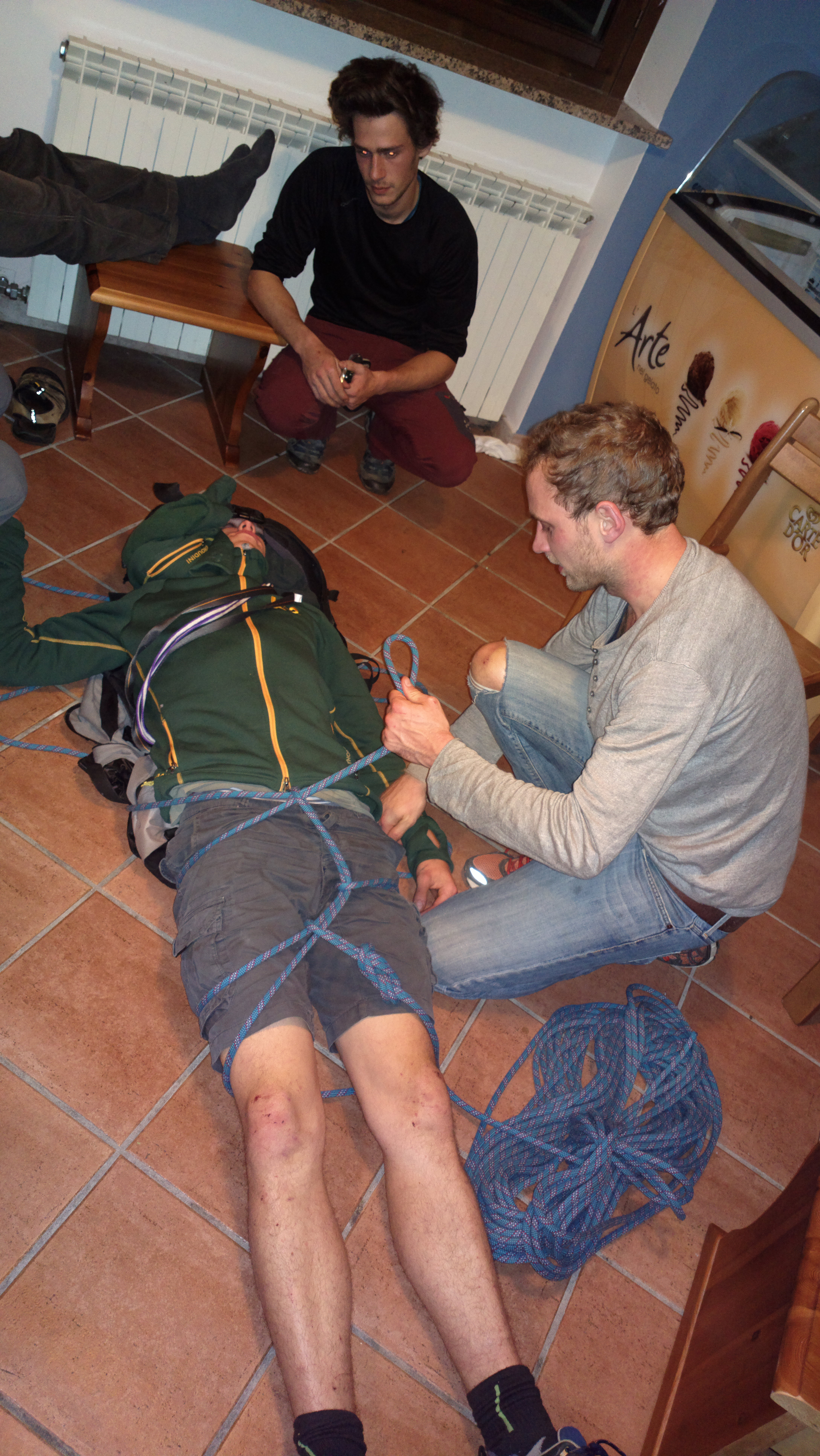 Vandaag dezelfde routes als gisteren, maar de cordées werden door elkaar gegooid. Jeroen, Arne en Niels in “Diedro”, Kristof, andy en Friedel in “Disperazione”. Kristof klom voor, tot bloedens toe. Grote friends boden weer troost en geruststelling. Sebastiaan en Denis klommen de Nautilus en kregen eindelijk de Gopro in gang, beelden volgen nog. Incastromania is een single-pitch lengte die zeker de moeite waard is. Het is een mooie barst waar je van onder tot boven handjams kan oefenen. Na apero en avondeten kregen we ”Toegepaste EHBO technieken” aangeleerd door Dokter Kristof.