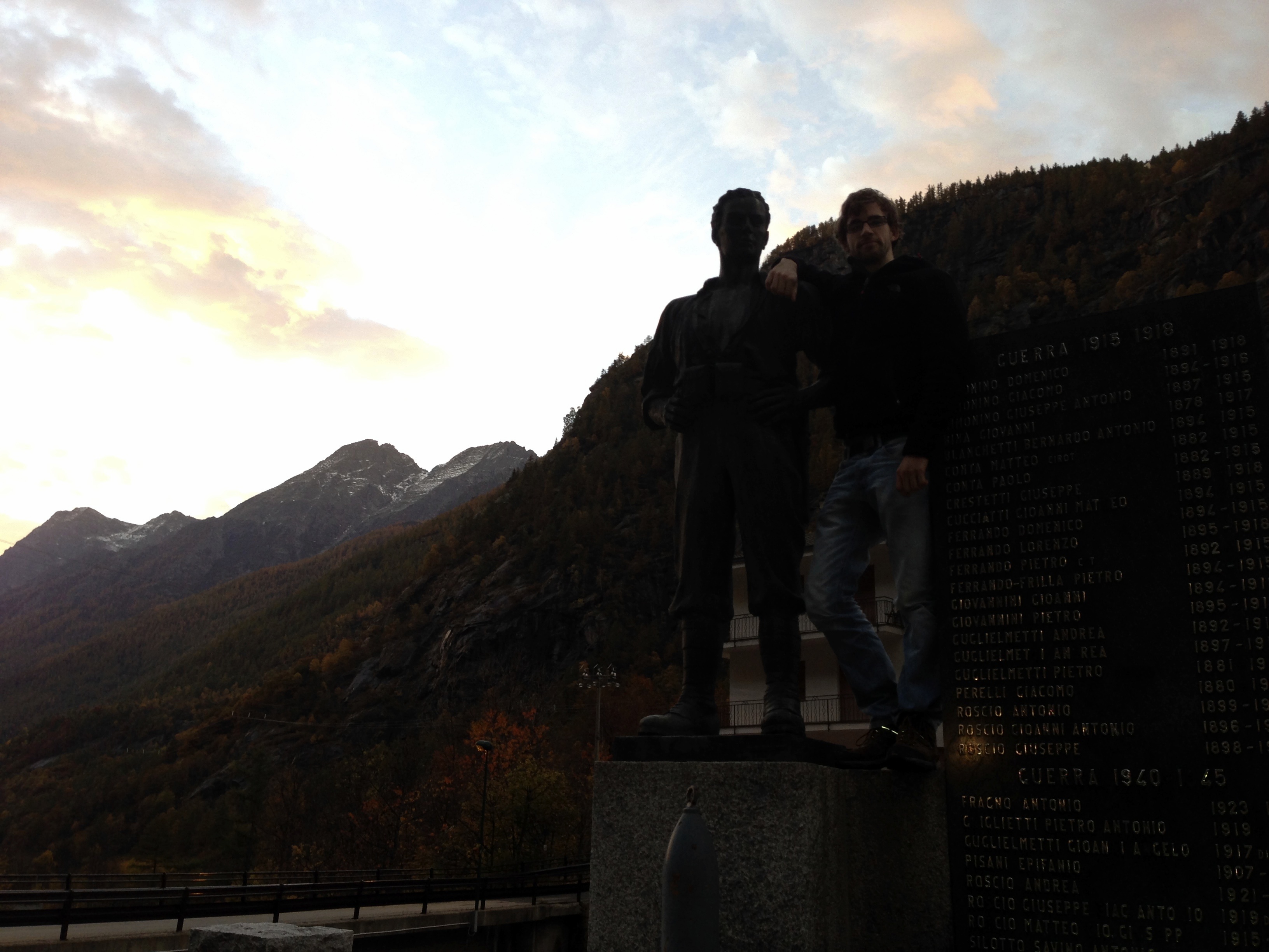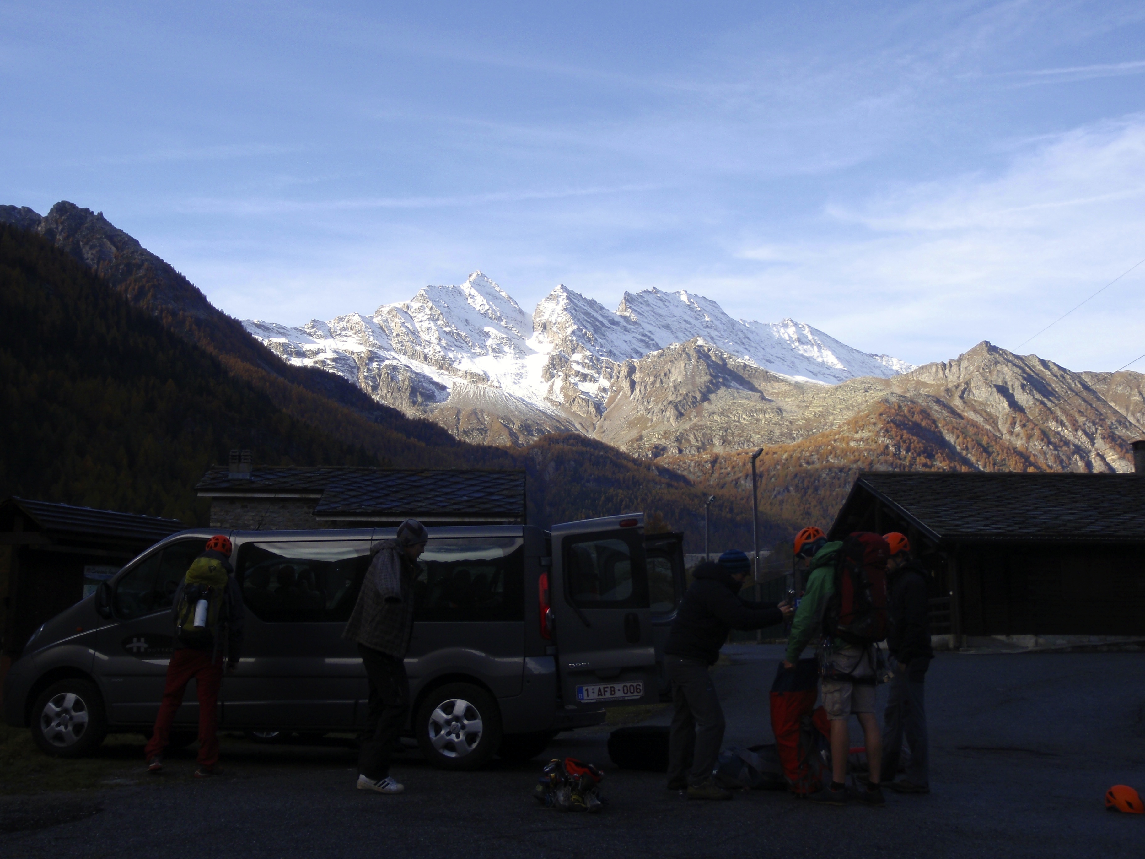 Vrijdagavond, 25 oktober. Het houttequiet busje rijdt het land rond om de MC5 deelnemers op te pikken voor een rit de hele nacht door. Bestemming? Noasca. Een dorpje van slechts 197 inwoners, gelegen in Turijn, op 1065m, aan de rand van het Parc Nazionale Gran paradiso. Op zaterdagochtend kwamen we aan in de Orco vallei. Om onze aankomst te vieren werd het dorpswinkeltje geopend. De omzet van deze week was meteen weer goedgemaakt. Na een deugddoend ontbijt op het dorpsplein naast de stroom Orco leerden we bij zonsopgang de lokale bar “Gran paradiso” kennen. De Italiaanse koffie konden we wel verdragen en de chocolademelk was sterk genoeg om je lepel rechtop te plaatsen.
