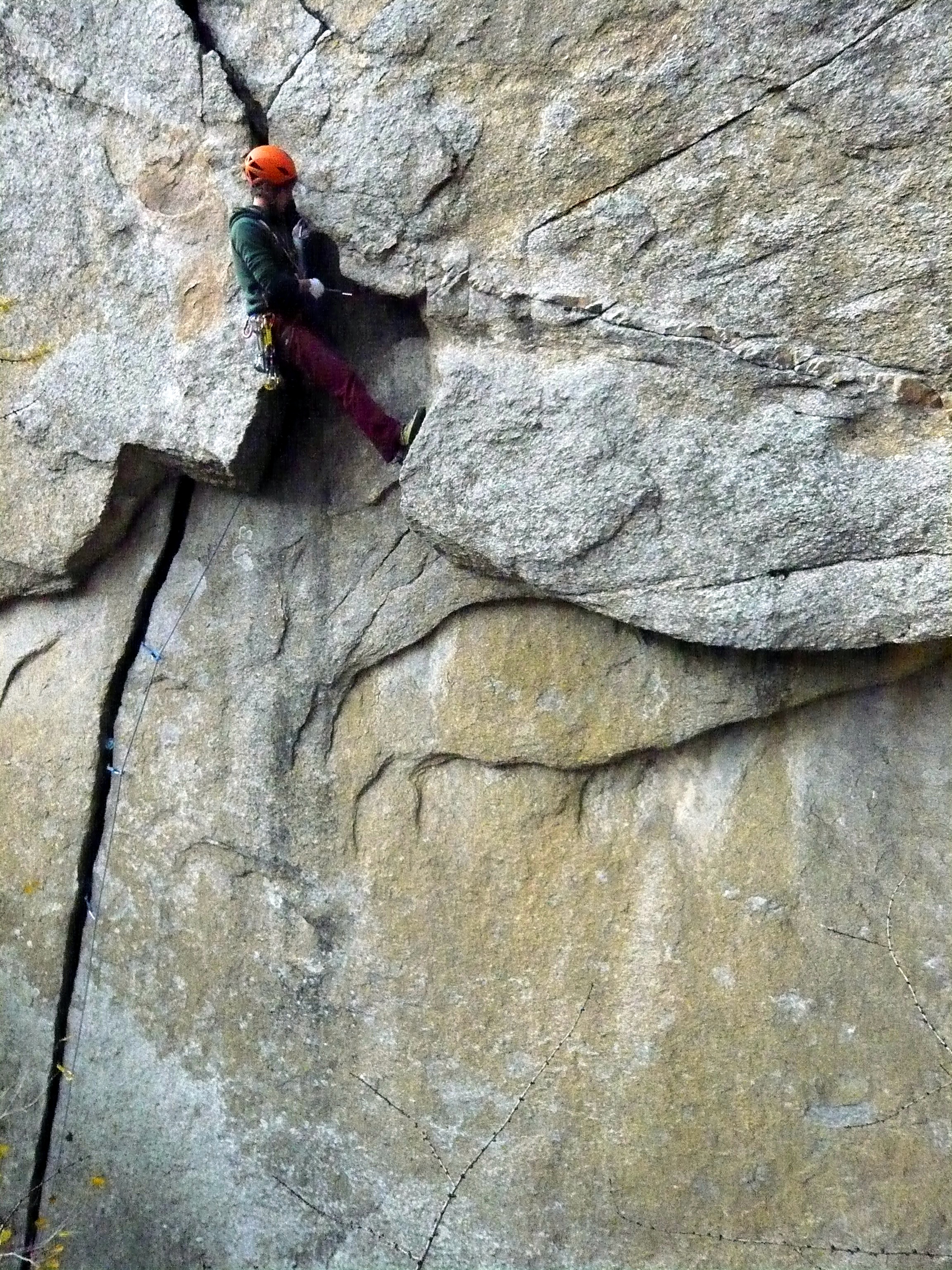 Op het programma vandaag: “Via Dei camini”, voor Sebastiaan als voorklimmer met Kristof en Arne, gevolgd door “Tempi moderni” voor Denis en Friedemann. “Diedro Nanchez” stond hoog op het verlanglijstje van Niels, Andreas (Andreas “Andy” Klein, Oostenrijkse berggids die Arne kwam versterken voor de stage) en Jeroen. Die ochtend was deze route echter omgetoverd tot de douche van het gebied. Dit samen met natte algen in een te dulferen 6B+ deed Hen beslissen iets anders te zoeken. Om toch in dezelfde sector te blijven werd besloten het cordée van Sebastiaan te volgen. De nodige voorklimvalletjes gaven vertrouwen in ons materiaal en iedereen kreeg een pak slaag waar nodig. We merkten dat dit niet meer onze eerste dag op graniet was, en hier en daar bleven onze hand-jams al steken. Tegen de avond betrok de lucht en keerden we terug. Vlak voor het donker was iedereen bij de auto. Lekkere pasta en een heel grote fles wijn brachten ons verder in de avond.