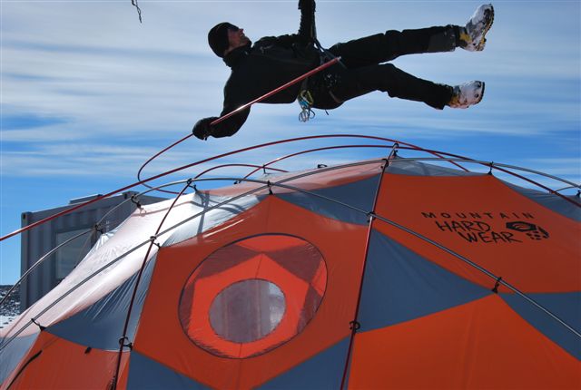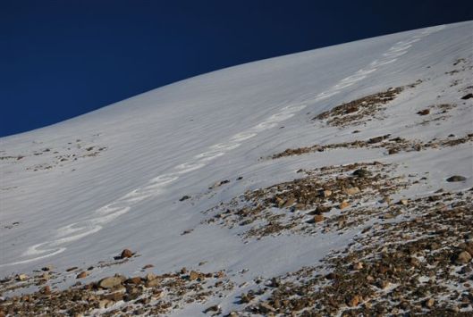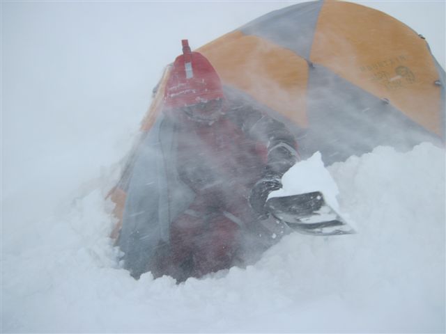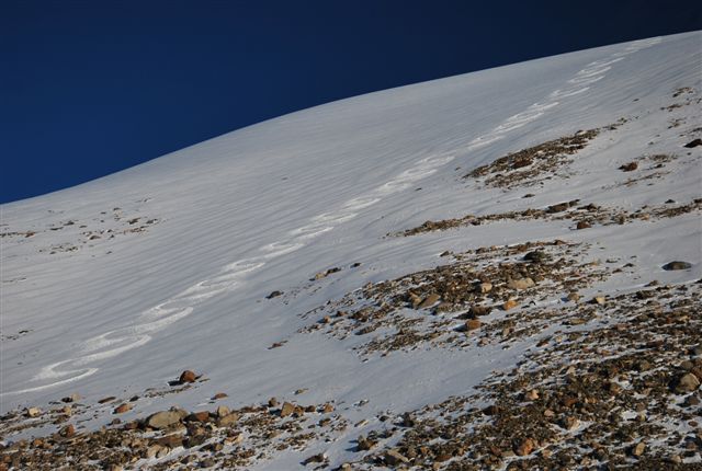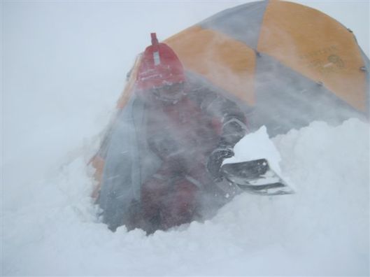 ’s Morgens is het prachtig weer en de stemming geraakt bedrukt. Gisteren zijn we niet alleen omwille van de regen teruggekeerd. De loodzware instijg, het vooruitzicht om weer een paar dagen zwaar af te zien door toch met meer water en materiaal te sleuren dan we zouden willen en niet te vergeten de vermoeidheid van de afgelopen weken, maakten evenzeer deel uit van het beslissingsproces. Waarom pakken we het niet wat rustiger aan en doen wat haalbaarder beklimmingen waar we tenminste wat van kunnen genieten? Stom dat we dat gisteren niet konden toegeven. Dan hadden we vandaag met dat mooie weer een wellicht leukere beklimming kunnen doen. We houden het nodige overleg en beslissen voor een bescheidener aanpak.