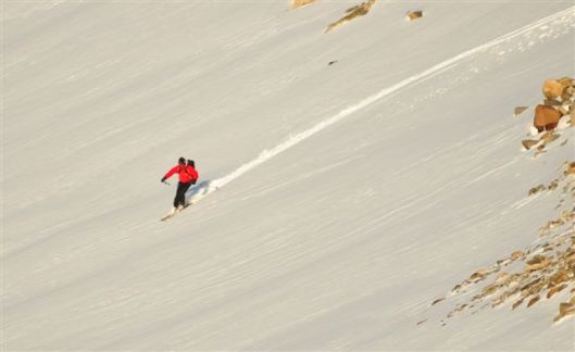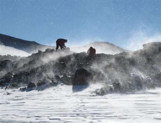 Want dat blijkt het grootste nadeel te zijn aan deze mooie route. We moeten 500Hm omhoog ploeteren over een 30° steile puinhelling, variërend tussen klein en los gruis waarbij je drie stappen moet zetten om er één vooruit te komen, tot enorme blokken die wankel op elkaar balanceren en waar je zo een been kan breken of verpletterd kan worden. Wanneer we twee uur aan het ploeteren zijn, begint het te regenen en komen we twee Russen tegen die aan het afdalen zijn. Volgens hen wordt het twee dagen slecht weer. Balen dus. We dumpen ons materiaal onder een grote boulder, halen onze slaapzakken weer uit de bagage en dalen noodgedwongen weer af. Tegen de tijd dat we weer beneden zijn, afdalen blijkt zelfs nog lastiger dan stijgen door dit klote terrein, houdt het op met regenen en klaart het weer op. Hebben we ons dan weer laten vangen door het weer?