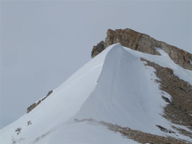 Op dit moment barst er enkele kilometers naar het zuiden een onweer los en dit brengt de nodige stress met zich mee. Rappelen is hier geen goede optie, dus we moeten maar zo snel mogelijk doorklimmen. Het klimmen is continue in de moeilijkheidsgraad 6a-6b maar met zeer goede rotskwaliteit. Na vier lange lengtes besluiten we om een grote overhang te vermijden en klimmen links weer de graat op. Hier vermoeden we weer op de juiste weg te zitten en er volgt een zeer mooie lengte 6b langs een micro schelp, waar we geen beveiliging in kunnen steken en die zo dun is dat hij elk moment lijkt te kunnen breken. Twee lengtes verder en na 9 uur klimmen zijn we op de top van de Pamir Pyramid (3700m), waar we tegelijkertijd op R4 zijn van Perestroika crack. Zo hebben we die toch eens van dichtbij gezien. Het onweer is op een kilometer van ons blijven hangen en we komen er goed vanaf.