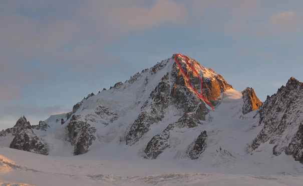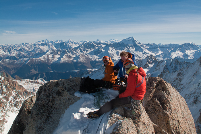 Zes lange, maar mooie lengtes – we klimmen af en toe simultaan – met een korte crux loodrecht ijs brengen ons tot op een kleine col van waaruit we enkele Britten de laatste meters zien afleggen van de Migot-pijler. Een laatste inspanning door wat ploetersneeuw brengt ons tot de top van de Chardonnet.