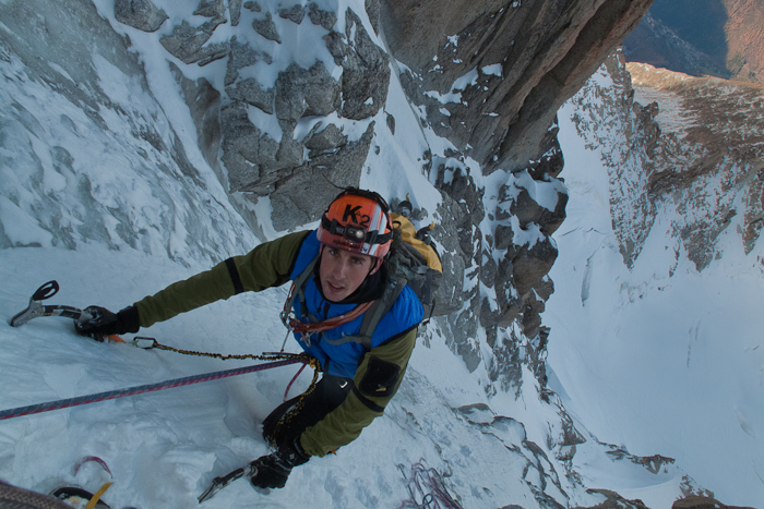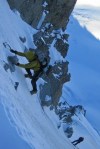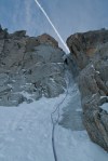 Om 6u de volgende ochtend vertrekken we de gletsjer omhoog richting de basis van “goulotte Escara”. De 30 centimeter sneeuw die de voorbije nacht gevallen was, zorgt ervoor dat we moeizaam vorderen en pas om 7u45 aan de start van de route staan.