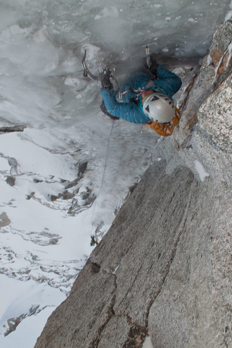 Wat funky klimmen en creatieve bijl en crampon-plaatsingen – wat is het geluid en de geur van metaal op rots toch heerlijk – komen we na 3 lengtes tot een punt waar we het de moeite niet meer vinden om verder te klimmen (dal + crampons = not fun). Enkele rappels door het couloir Perroux brengen ons terug richting een oververhitte Valée Blanche.