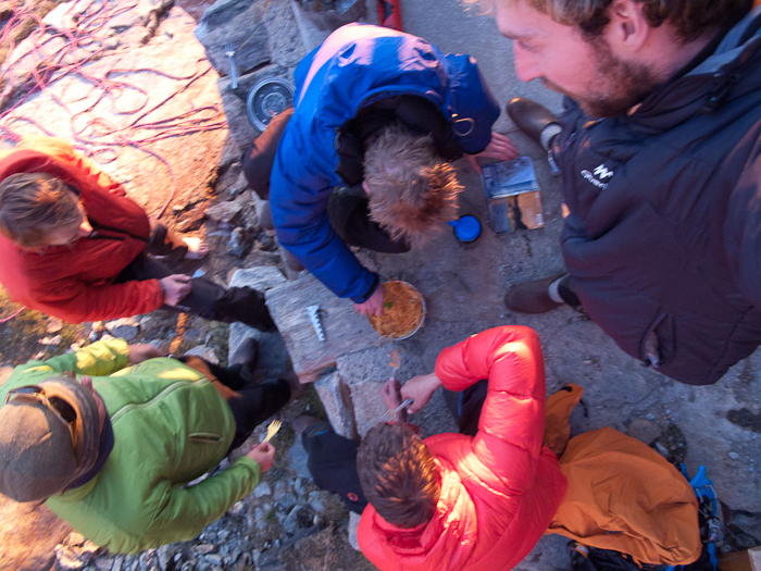 Gezien een Franse cordee ons voor was via de Migot vinden we de rappels makkelijk en staan we enkele uren later terug aan de tent. Een lastige lange afdaling met veel honger (we hadden veel te weinig koeken mee naar boven) brengt ons tot in de Poco-Loco, alwaar we de nodige calorieën terug aanvullen!