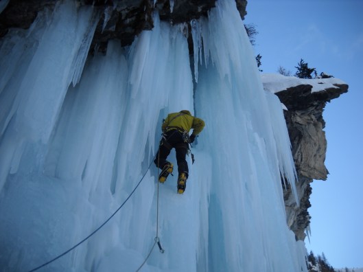 Juist naast dit massiefje ligt À la mémoire du bouquetin (II 5+ 100m) waarvan Matti de eerste lengte klimt en een toprope installeert zodat we onze vijf paar verschillende ijsbijlen kunnen testen (in Cogne zijn verschillende testcentra van onder meer Grivel, Black Diamond, E-Climb,… waarbij je gratis bijlen voor een dag kan gaan uittesten). Nadat ik de waterval ook eens op en neer gegaan was klom Matti een M7 voor. Ik klom hem na en pomp nog wat extra melkzuur naar m’n voorarmen.