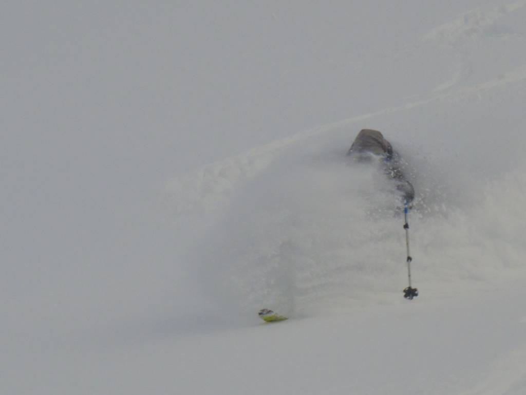 Na een half dagje skiën in een koud, vochtig en bewolkt Montegèvre met als enig hoogtepunt onze vermelding in de Dauphiné Libéré, was het tijd om de wijze raad van Rogier Van Rijn te volgen. De tocht naar de Maït Damut zou ons 1200 meter hoger brengen tot diep in het hart van de Queyras. Als opwarmertje kon dit al tellen! Na enkele uren besloten we niet tot aan de (gespoorde) top te touren, maar al iets eerder in een maagdelijke helling te droppen.