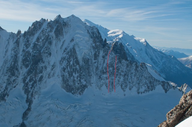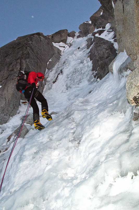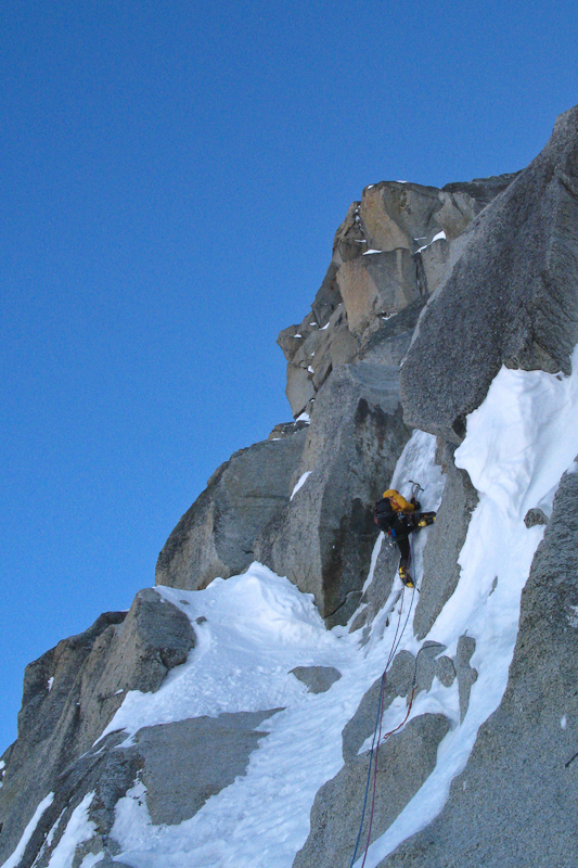 In de auto is het redelijk stil, beiden denken we aan de Salbit. Ik zeg nog tegen Walter dat hoewel er zeker ook hele lange en mooie lijnen aan Envers des Aiguilles zijn, ik niet direct een bepaald doel heb om de volgende dag te doen. En plots denk ik aan een lijn die ik al lang heb willen klimmen, maar het is er nog nooit van gekomen: de Frendo pijler! Slechts een paar problemen, het is al 12u, we zijn onvoorbereid, en we moeten dan die dag nog de lift nemen, maar vooral: Walter heeft weinig tot geen alpiene ervaring. De Frendo pijler is zo’n 1200 meter hoog, waarvan 800 meter een rotspijler klimt waarna nog zo’n 400 meter sneeuw/ijsterrein volgt. Gelukkig ligt al mijn alpien gerief in de auto, omdat ik de volgende week met Friedemann, Kristof en An zou alpien klimmen. Ik stel Walter gerust door te zeggen dat ik wel alle sneeuw/ijslengtes zal voorklimmen. Omdat hij uiteraard niet enkel meegaat als belay buddy, zal hij dan de rotslengtes voorklimmen.