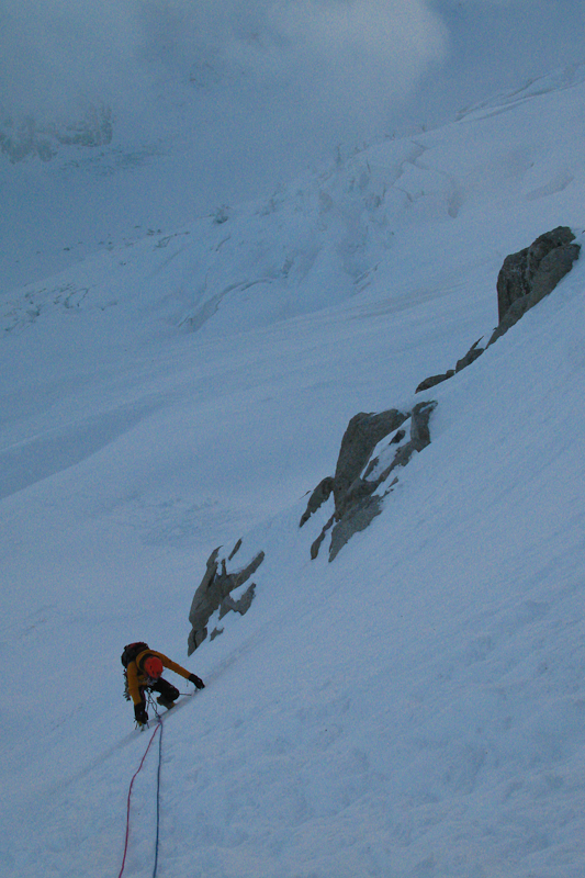 Eerst zet ik de wekker om 4u. Je moet namelijk snel genoeg doorheen de 800 hoogtemeters rots klimmen, om dan aan de sneeuw- en ijslengtes te beginnen die de volle zon vangen. Als we om 9u ’s avonds in onze slaapzakken kruipen, valt me op hoe warm het is en hoe de zon brandt! Ik zet de wekker toch maar om 2u. Na ontbeten te hebben en de slaapzakken en matjes tussen wat stenen verstopt te hebben, beginnen we om kwart voor 3 met de koplamp aan te lopen. Helaas moeten we eerst nog door een diepe put op de gletsjer maar uiteindelijk staan we na een dik halfuur aanlopen aan de voet van de wand. Het is nog pikdonker, ook met koplamp, en dat zullen we geweten hebben. We klimmen eerst verkeerd omdat we teveel naar rechts de eerste diagonaal volgen (tot zover de vage foto in mijn gsm). Na even te proberen, te beseffen dat we verkeerd zitten en terug afklimmen staan we uiteindelijk een uur later weer in de correcte route. Vanaf daar gaat alles perfect en Walter vlamt vooruit, op kop, en dat op D-schoenen! We voelen dat we beiden niet geacclimatiseerd zijn als we hoger komen, maar uiteindelijk ligt de top van de Midi ook maar op 3800/3900 dus dat gaat wel. We zien een prachtige zonsopgang, enkele honderden meters hoog in de route, en toppen uiteindelijk het rotsgedeelte om 7u30 ’s morgens.