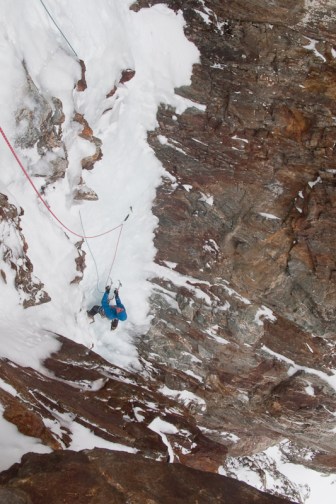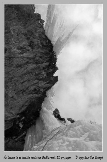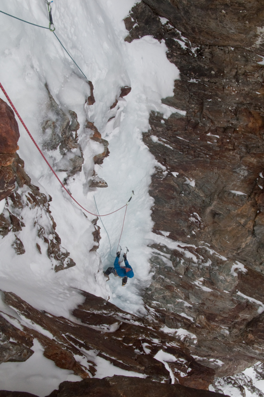 Doordat er weinig ijs in de route ligt start de 4de lengte eveneens met een lastige mixte traverse. Een kleine 3 meter rechts ligt de ijsgeul, De voeten hebben steun aan een dun laagje ijs dat over de rotsen ligt. De bijlen moeten op zoek naar kleine oneffenheden op de rots, stukjes mos of zich vastzetten in het beetje sneeuw dat tegen en tussen de rotsen plakt. Sneeuw die slechts een keer aangeraakt mag worden, een 2de keer en het valt uit elkaar. Tim klimt deze lengte voor. We hebben een bomvaste relais maar bij een klein foutje voor Tim bij het goede ijs komt maakt hij een serieuze pendel. Op zoek naar een eerste tussenzekering dus. Echte barsten voor klemblokken komen niet voor maar na enig graven in de sneeuw vind Tim een gat waar hij zijn bijl ondersteboven in kan haken. Zo geraakt hij in de buurt van een dikker plekje ijs voor de eerste ijsvijs. Nog enkele voorzichtige passen tot bij het echte ijs en dan is Tim vertrokken.