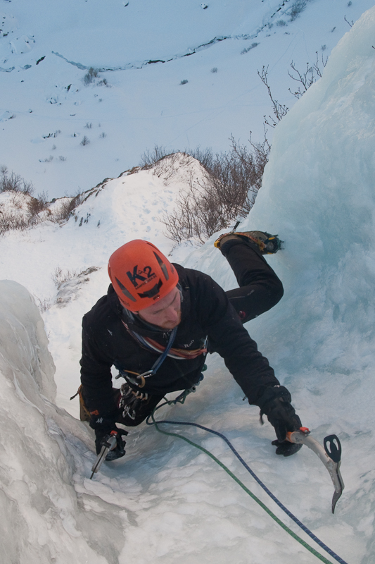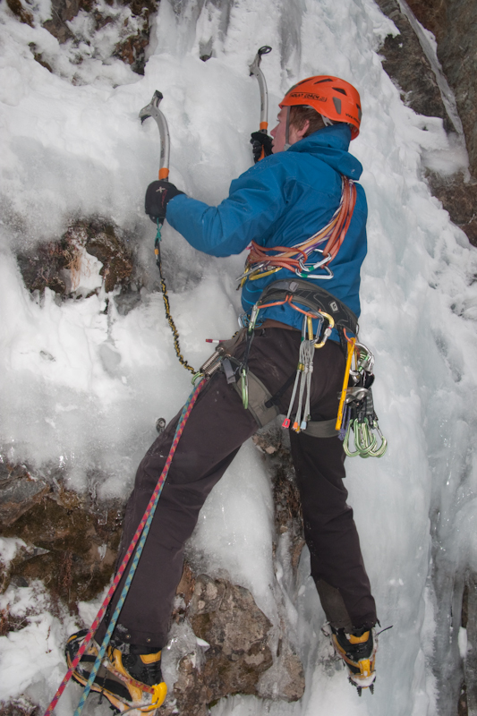 We amuseerde ons de hele dag met van de ene ijslijn naar de andere te klimmen en nieuwe varianten uit te proberen. Een ideale voorberereiding op het echte werk zou ik het niet noemen, maar in ieder geval leuker en exclusiever dan een namiddag in de klimzaal!