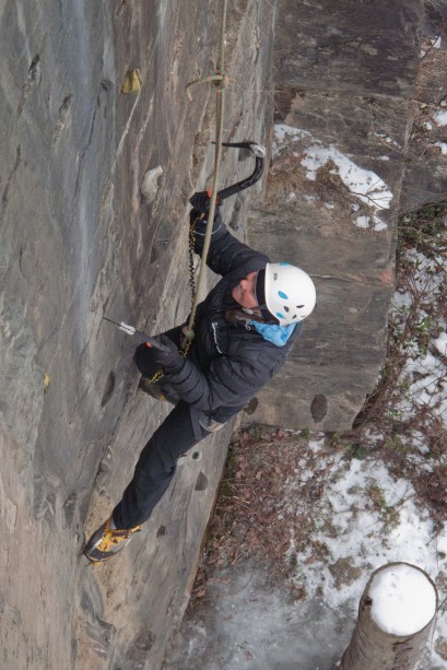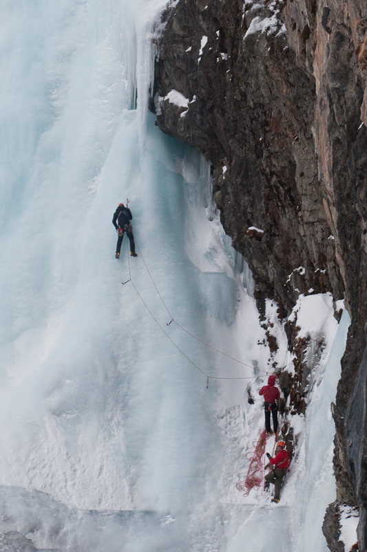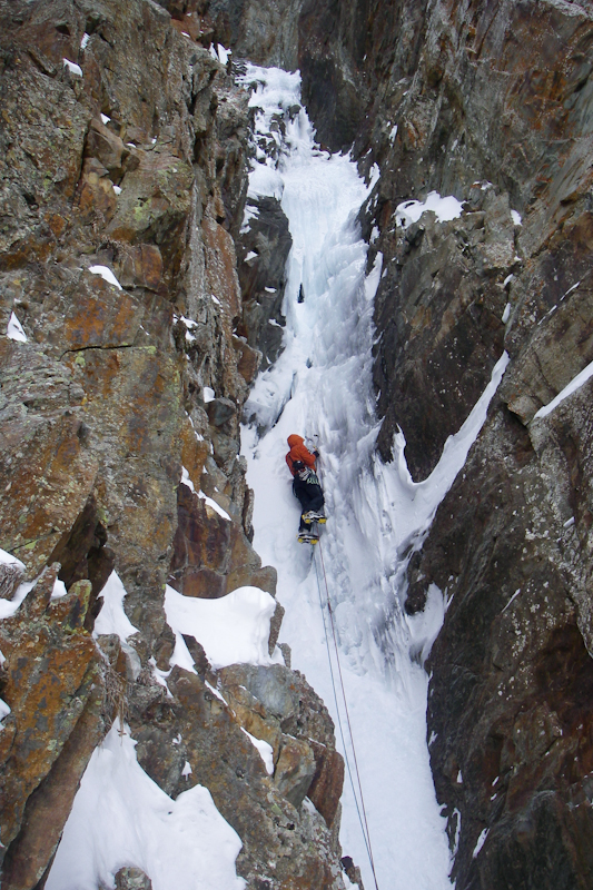 De laatste lengte loopt normaal door een tunnel. De tunnel is er. Het ijs ontbreekt. Snel rapellen we terug naar beneden. We zullen ons moeten haasten om voor het donker terug bij de auto te zijn.