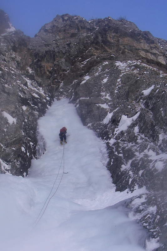 Tim klimt de 2 de lengte. Een stukje goulotte startend bij 70° dat stilaan steiler wordt met op het einde een klein muurtje van 90°. Geen muurtje uit ijs, maar uit een poedersneeuw die zich nog niet volledig tot vaste firn of goulotte-ijs heeft omgezet. Ook hier komt het erop aan van op tijd een tussenzekering te plaatsen. Want juist in het moeilijkste stuk is dat niet mogelijk en valt er op weinig te vertrouwen.