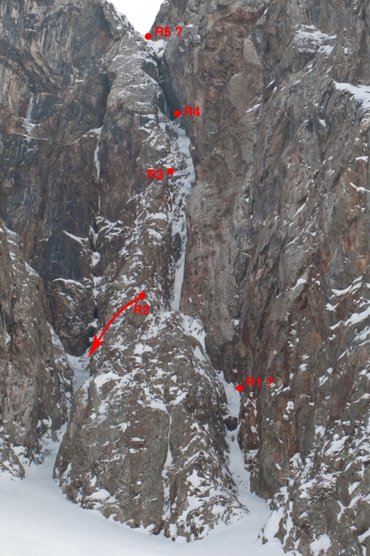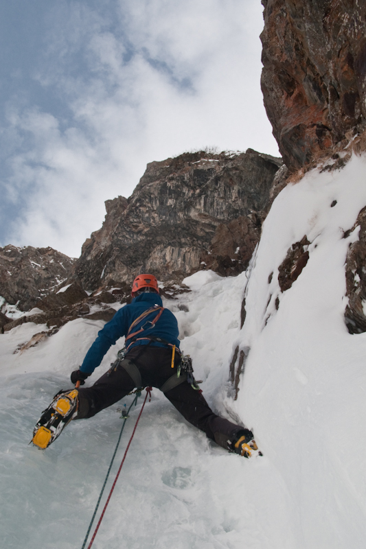 Ik start de eerste lengte, volgens de topo een sneeuwcouloir en een korte muur van 80 graden. Het sneeuwcouloir ligt er, de muur niet. Enkel een blok van een goede meter hoog die een 60 centimeter overhelt versperd het couloir. De meeste watervallen aan de noordkant van Vallon Du Diable ligger er dunnetjes bij. Normaal zal er over deze blok dus ook wel ijs liggen? De enige tussenzekering hangt nu al een 10 tal meter onder me en deze passage doe ik toch liever veilig. Ik ga dus op zoek naar een mooi stukje ijs of barst. De 2 witte lijnen aan de zijkanten van de blok blijken losse poedersneeuw te zijn. Daar heb ik dus niets aan, zelfs niet om deze blok te omzeilen. Na een beetje graven onder de blok kom ik gelukkig nog een stevig stukje ijs tegen. Een veilige zekering kan ik dus toch plaatsen. Tussen de blok en de eigenlijke rots steek ik ook nog een klemblok. Een bijl haak ik eveneens onderin, mijn linkerbeen open op een kleine oneffenheid op de rots. Nu kan ik mijn lichaam naar achteren laten hangen zodat ik over de blok kan kijken. Links bovenop de blok plaats ik mijn andere bijl. 2 keer in losse poeder de 3 de keer in een iets vastere sneeuw maar met mijn volle gewicht kan ik er zeker niet aan hangen. Ik laat mijn bijlen even voor wat ze zijn en probeer met mijn handen mijn evenwicht te behouden verzet mijn rechtervoet en linkervoet en breng mijn rechterbijl eveneens boven de blok. Deze komt na de 2 de poging in vaste firn terecht. Ook mijn andere bijl breng ik in een klein barstje dat meer te vertrouwen is. Met het nodige gesukkel en geknars van Crampons komen mijn voeten stilaan ook boven.
