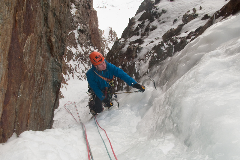 Terwijl ik het hier nu rustig neerschrijf weet ik dat het me zeker meer dan 5 minuten heeft gekost. Zoeken naar een goede zekering, de verschillende mogelijkheden afwegen, over de rots komen kijken en snel terug eronder door een vlaag spindrift, terug kijken, de bijlen plaatsen, terug rondkijken en afwegen,….Een klein stukje heerlijke mixte. Maar uiteindelijk geraakt de eerste lastige passage overwonnen. Ik klim verder door, maar mijn touw is bij de blok ergens tussen geraakt dus uiteindelijk moet ik relais maken. De beloofde relais aan de rechterkant is alleszins zoek. Tim komt na, en gelukkig, ook hij moet even uitzoeken hoe je erdoor geraakt.